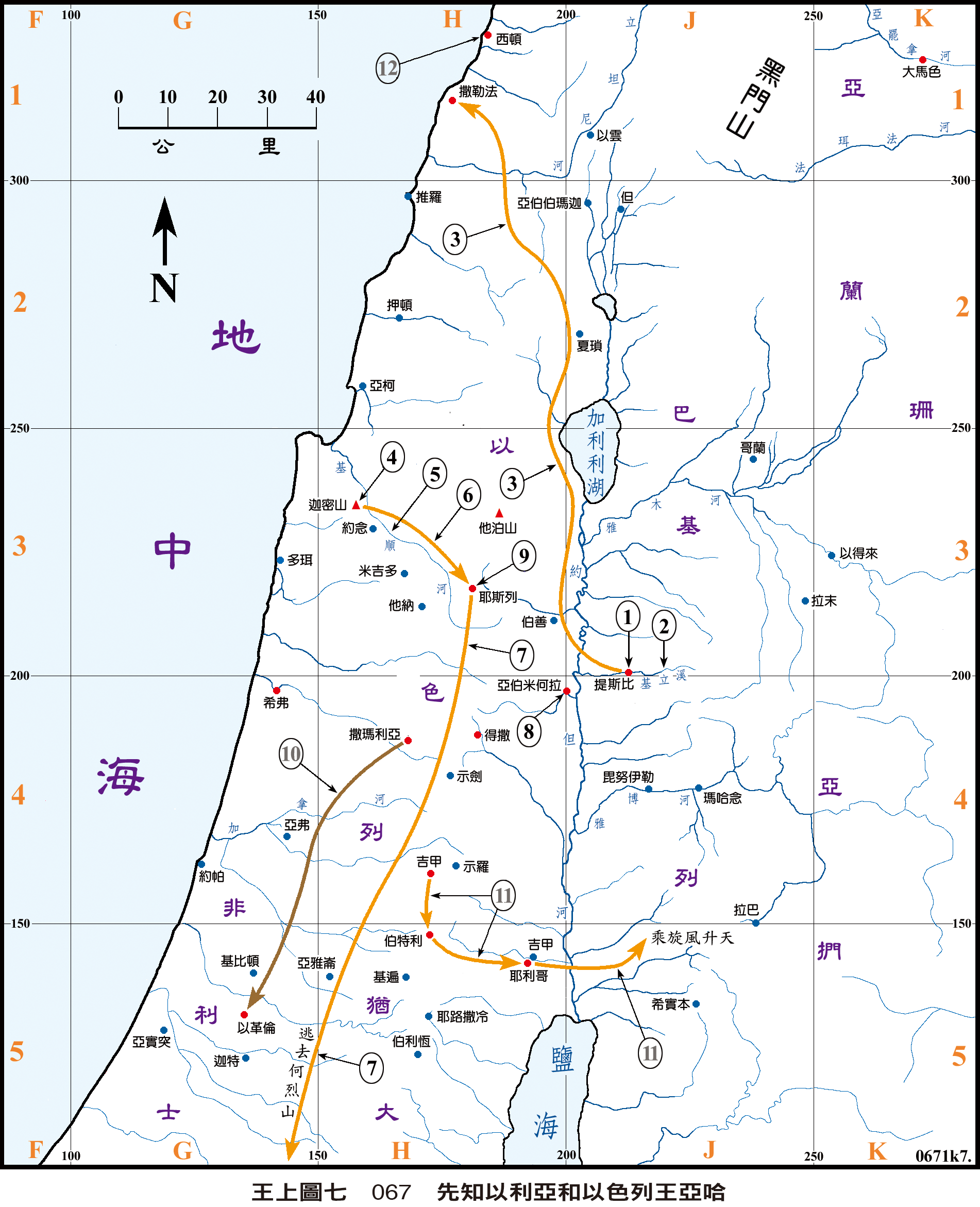 * #王上17:1-24| 基列寄居的提斯比人以利亞,見標線1,對亞哈王說:「我指著所事奉永生耶和華起誓,這幾年我若不禱告,必不降露,不下雨。」然後他奉命藏在約但河東邊的基立溪旁,見標線2;烏鴉早晚給他叼餅和肉來。後來溪水乾了,神命令他往撒勒法,見動線3。他到了城門,見有一個寡婦在那裡撿柴,以利亞請她取水給他喝,又請她也拿餅給他。那寡婦說她只有一把麵和一點油,那是她和她兒子最後的一餐。那婦人照以利亞的話行;他們吃了許多日子,罈內的麵和瓶裡的油果不缺短。這事以後,寡婦的兒子病死了,以利亞讓他死裡復活。寡婦說:「現在我知道你是神人,耶和華藉你口所說的話是真的。」