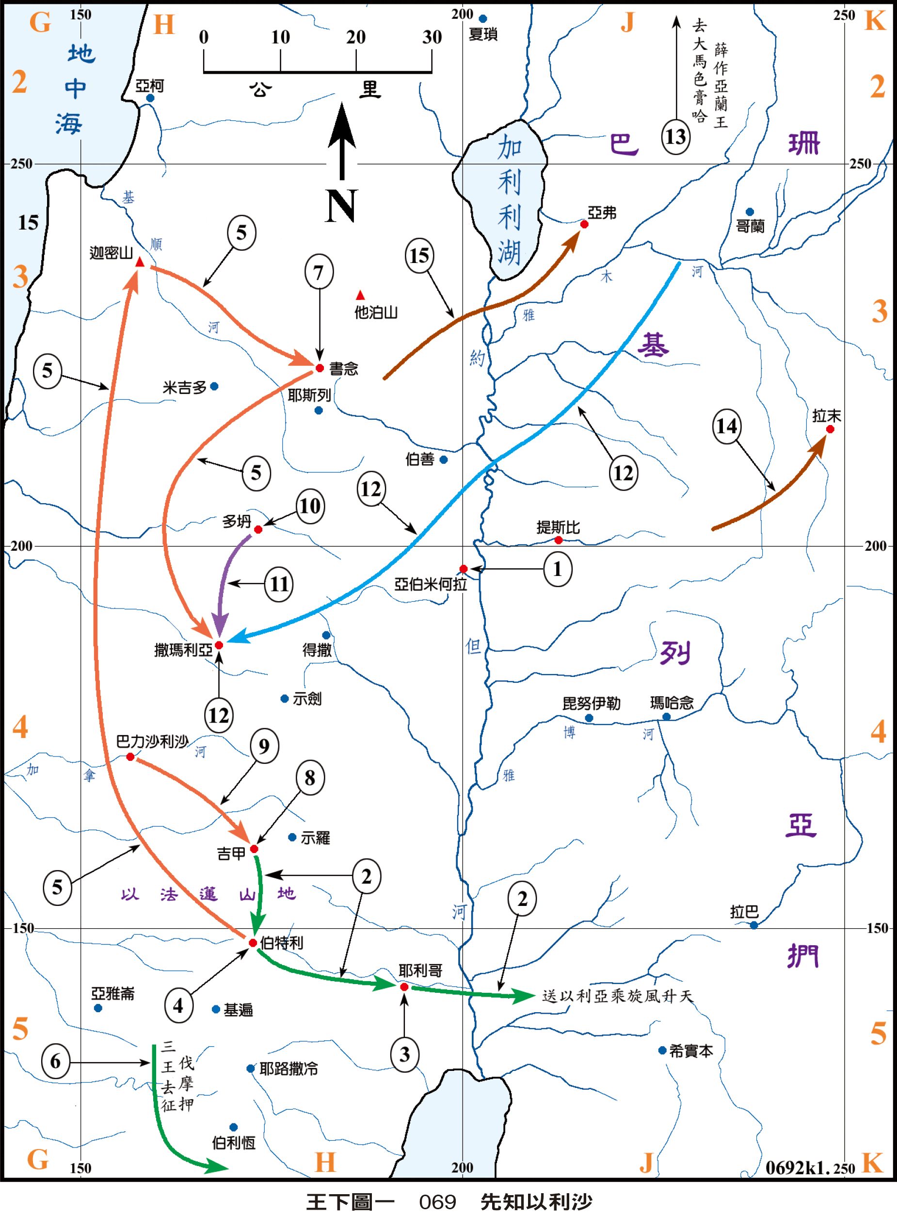* #王下3:4-27| 摩押王背叛以色列,以色列王約蘭聯合猶大王約沙法和以東王一同去攻打摩押,見動線6。軍隊在曠野沒有水喝,三國的王去求問以利沙;以利沙預言神要使三王的軍隊獲得泉水,並且要打敗摩押人。次日三王的軍隊果然獲得水源,並且也因這水源打敗摩押人。(參看王上圖八 $068)