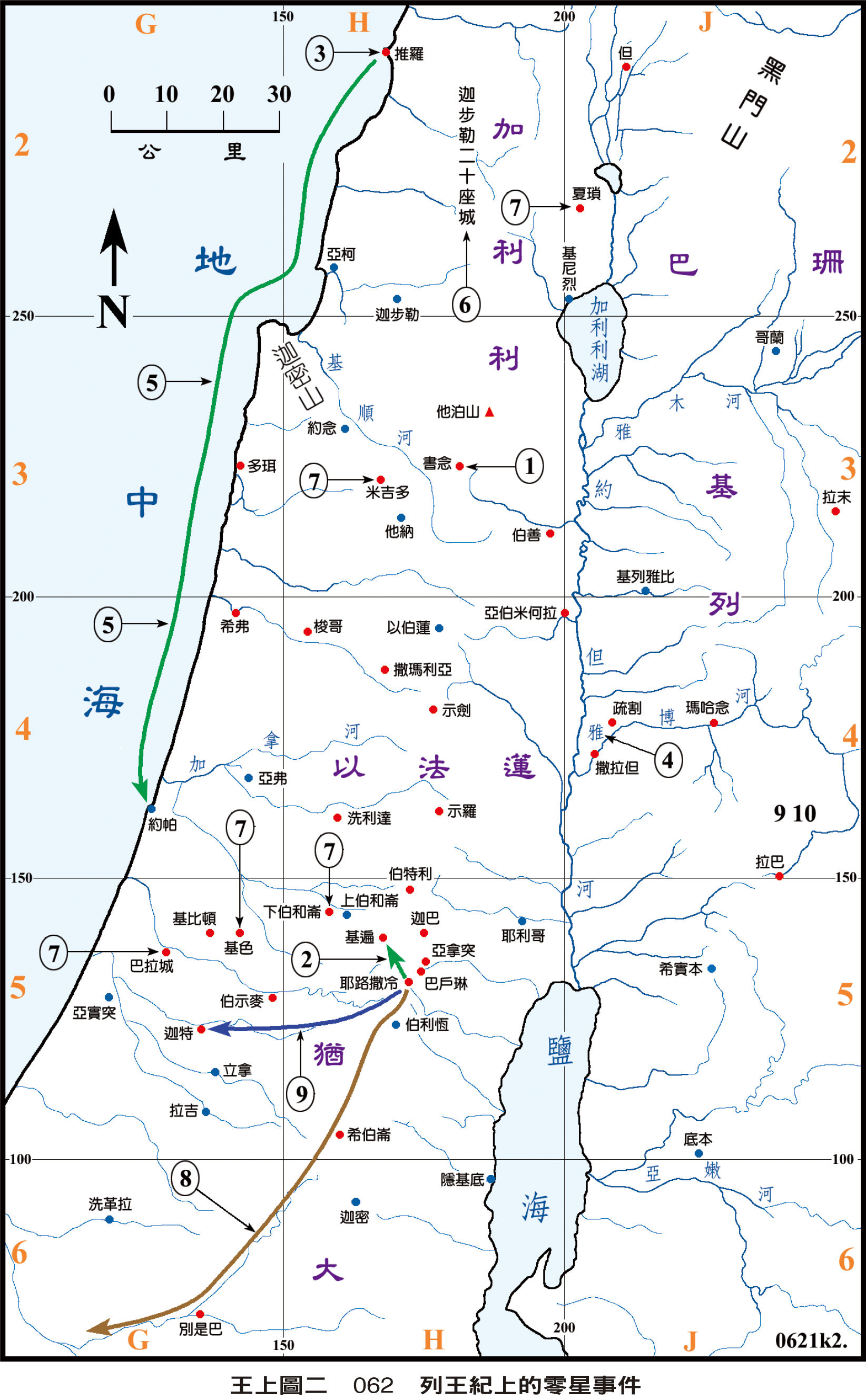 * #王上5:1-18;9:11-14| 推羅王希蘭全力配合提供所羅門王建造聖殿所需,將木材從黎巴嫩浮海運到約帕,見動線5,再運到耶路撒冷;所羅門王則每年提供糧食和油。聖殿和王宮完工時,所羅門王就把加利利地的二十座城給了希蘭,見標線6;這也許是所羅門的建築造成財政負擔。但希蘭很不滿意,就給它們起名叫迦步勒;後來希蘭把這些城送還給所羅門(#代下8:2|)。