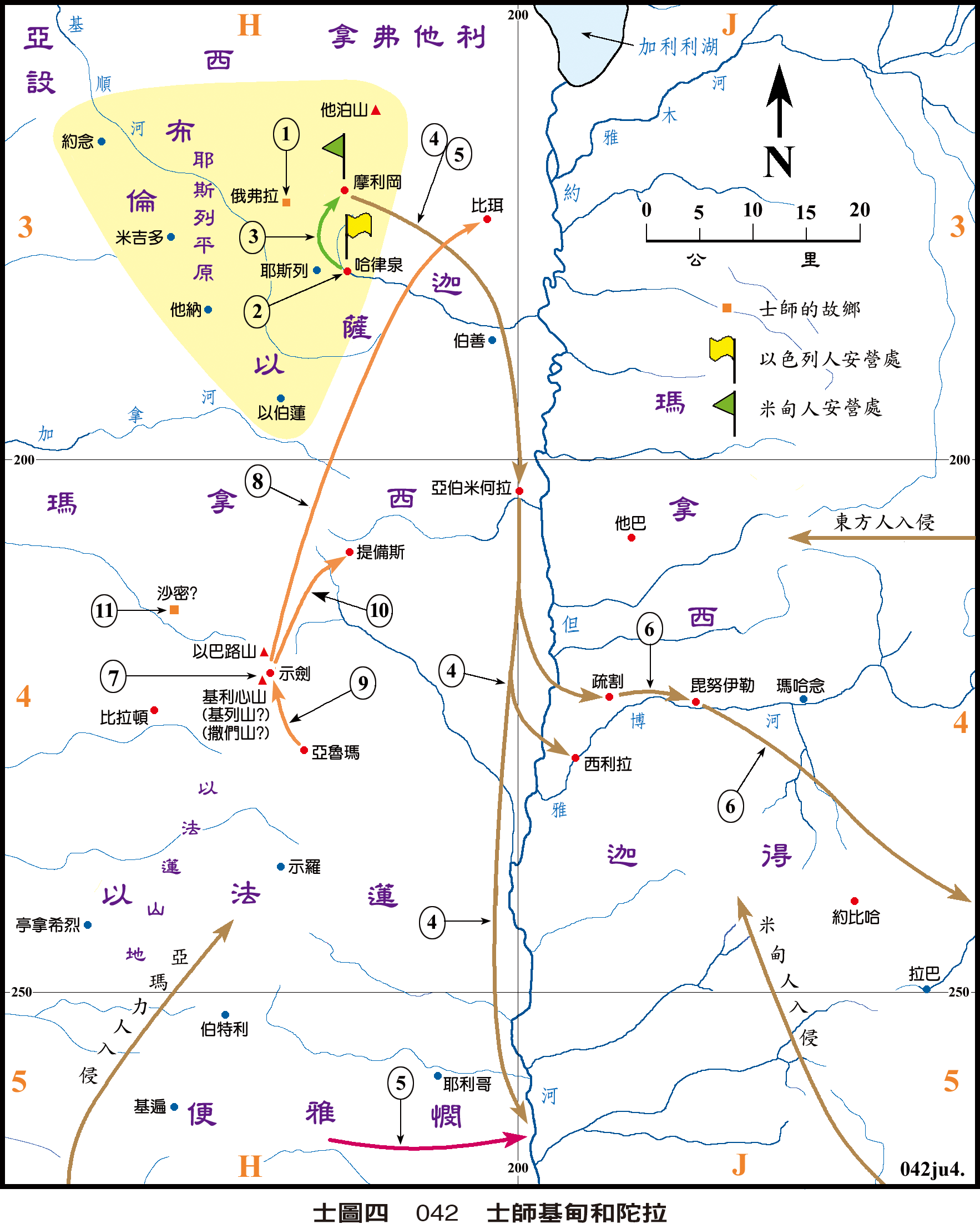 * #士7:9-22| 基甸帶著三百人,在半夜時分分三隊到摩利岡米甸人的營區旁吹角及吶喊,見動線3。耶和華使米甸人大亂,在營內用刀互相擊殺,再往來時的方向亂竄逃跑。以色列人此時也都出動來追剿米甸人,經亞伯米何拉往加各而去,見動線4。