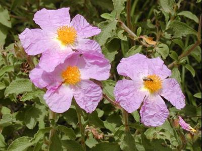 描述岩玫瑰灌木可长到约70厘米(28英寸)高,有多毛的叶子和较大的粉红色花朵。