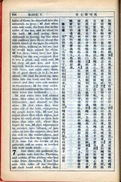 1931年新约全书广东话新译本与美国新译英文 马可福音 6 章 46 节到 7 章 2 节