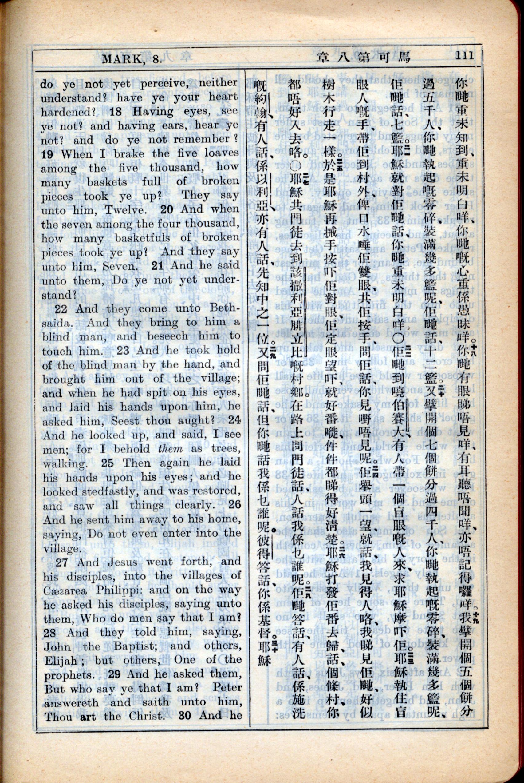 1931年新约全书广东话新译本与美国新译英文 马可福音 8 章 18 节到 8 章 29 节