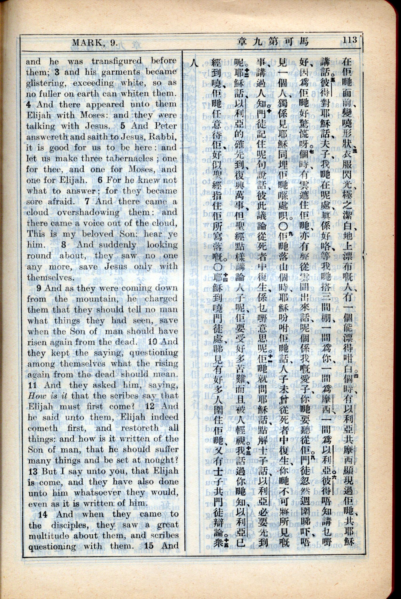 1931年新约全书广东话新译本与美国新译英文 马可福音 9 章 3 节到 9 章 14 节