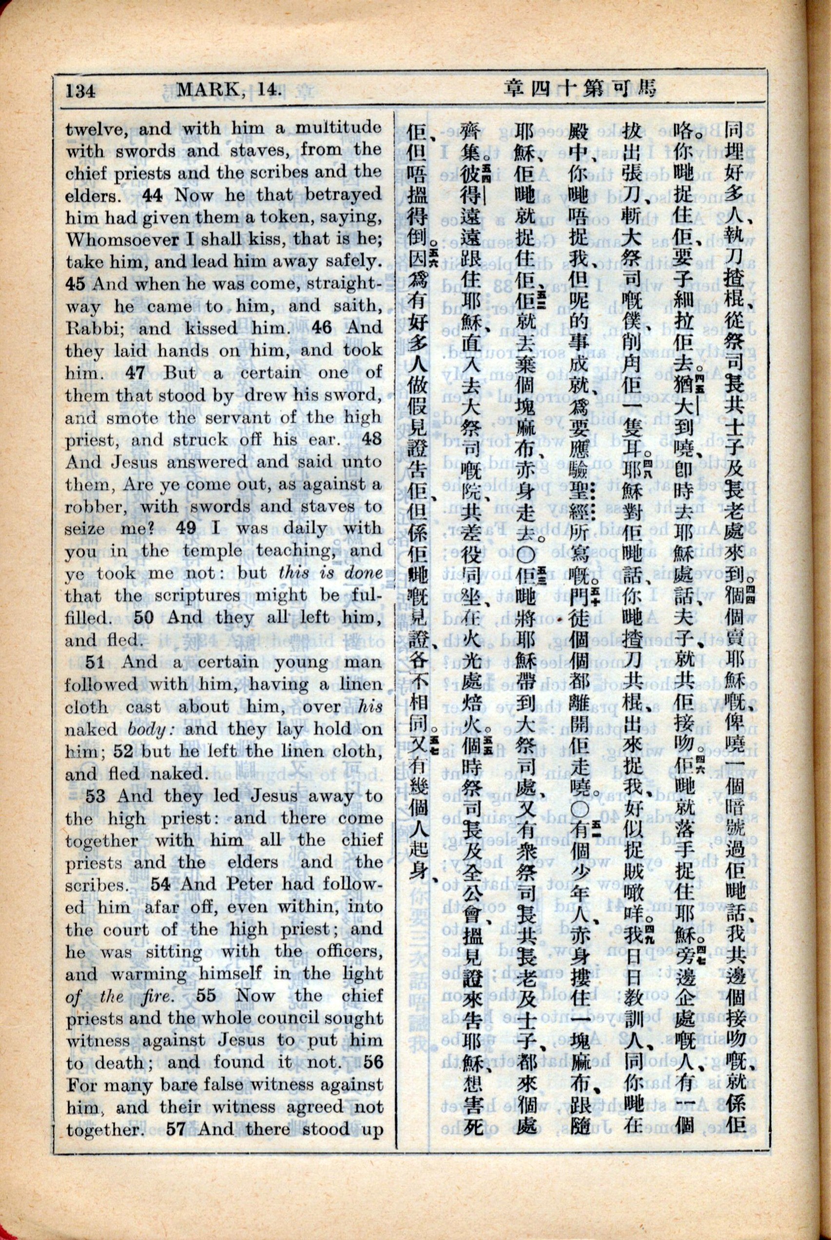 1931年新约全书广东话新译本与美国新译英文 马可福音 14 章 44 节到 14 章 57 节