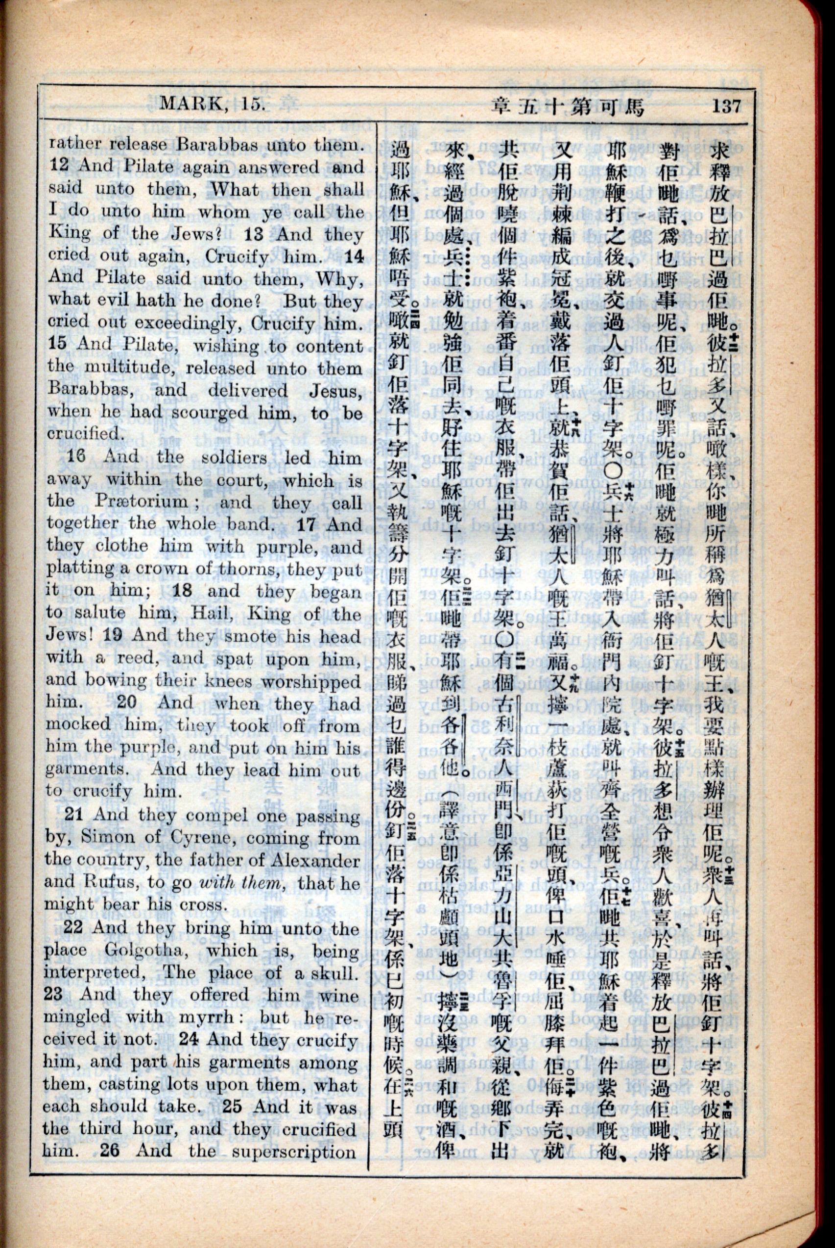 1931年新约全书广东话新译本与美国新译英文 马可福音 15 章 12 节到 15 章 26 节