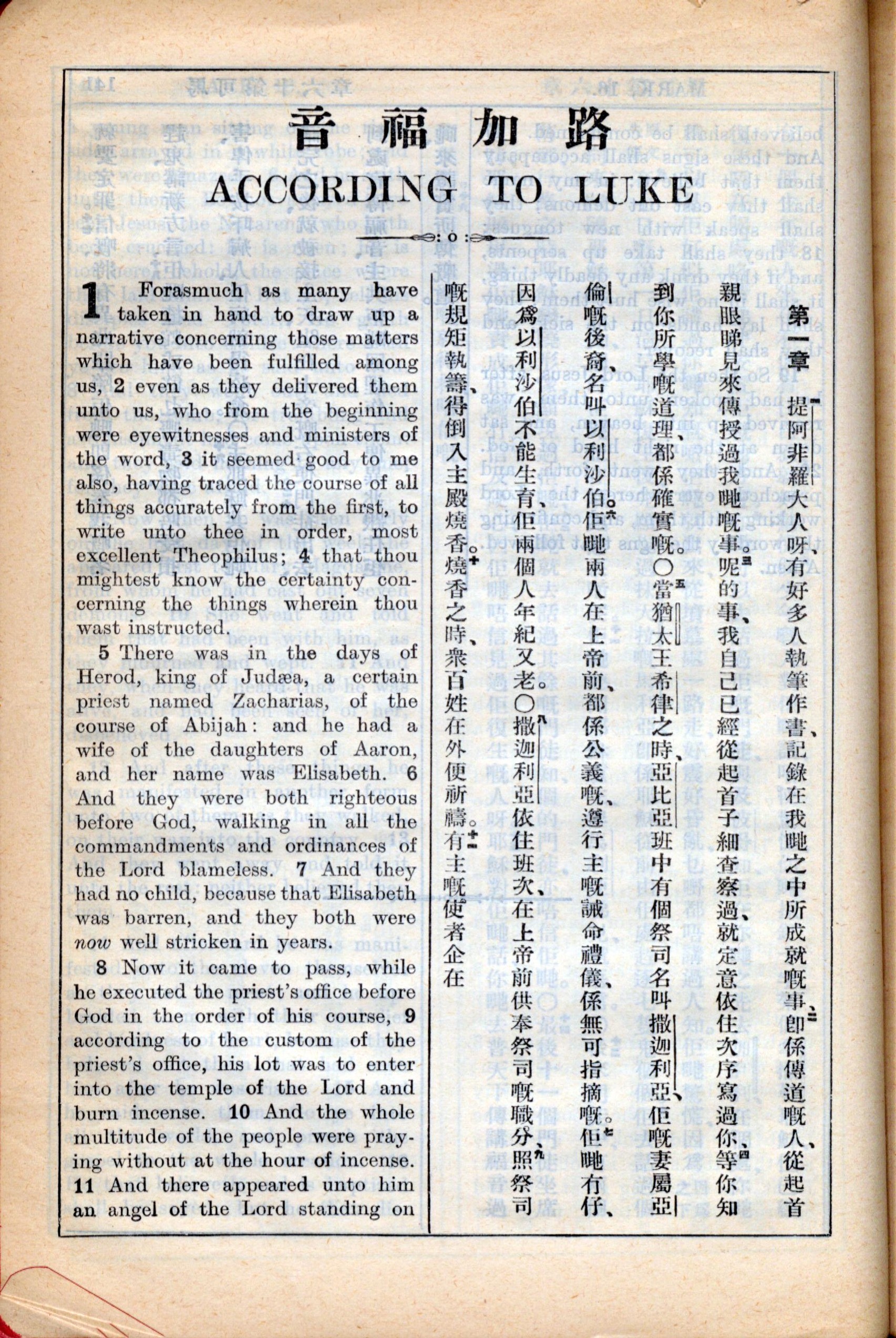 1931年新约全书广东话新译本与美国新译英文 路加福音 1 章 1 节到 1 章 11 节