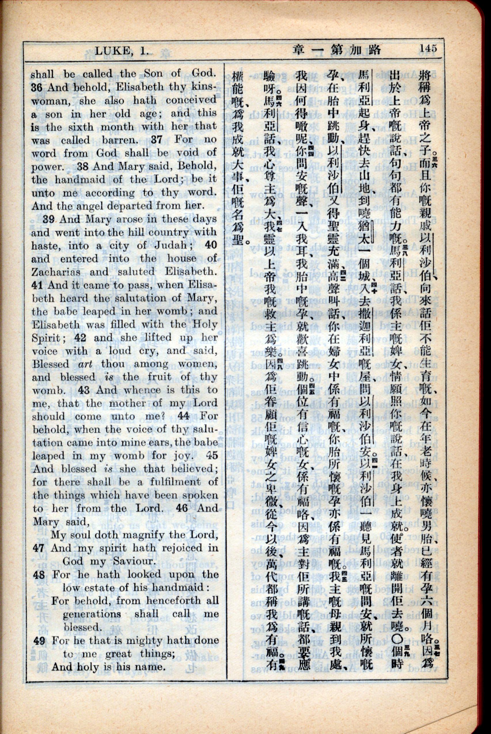 1931年新约全书广东话新译本与美国新译英文 路加福音 1 章 36 节到 1 章 49 节