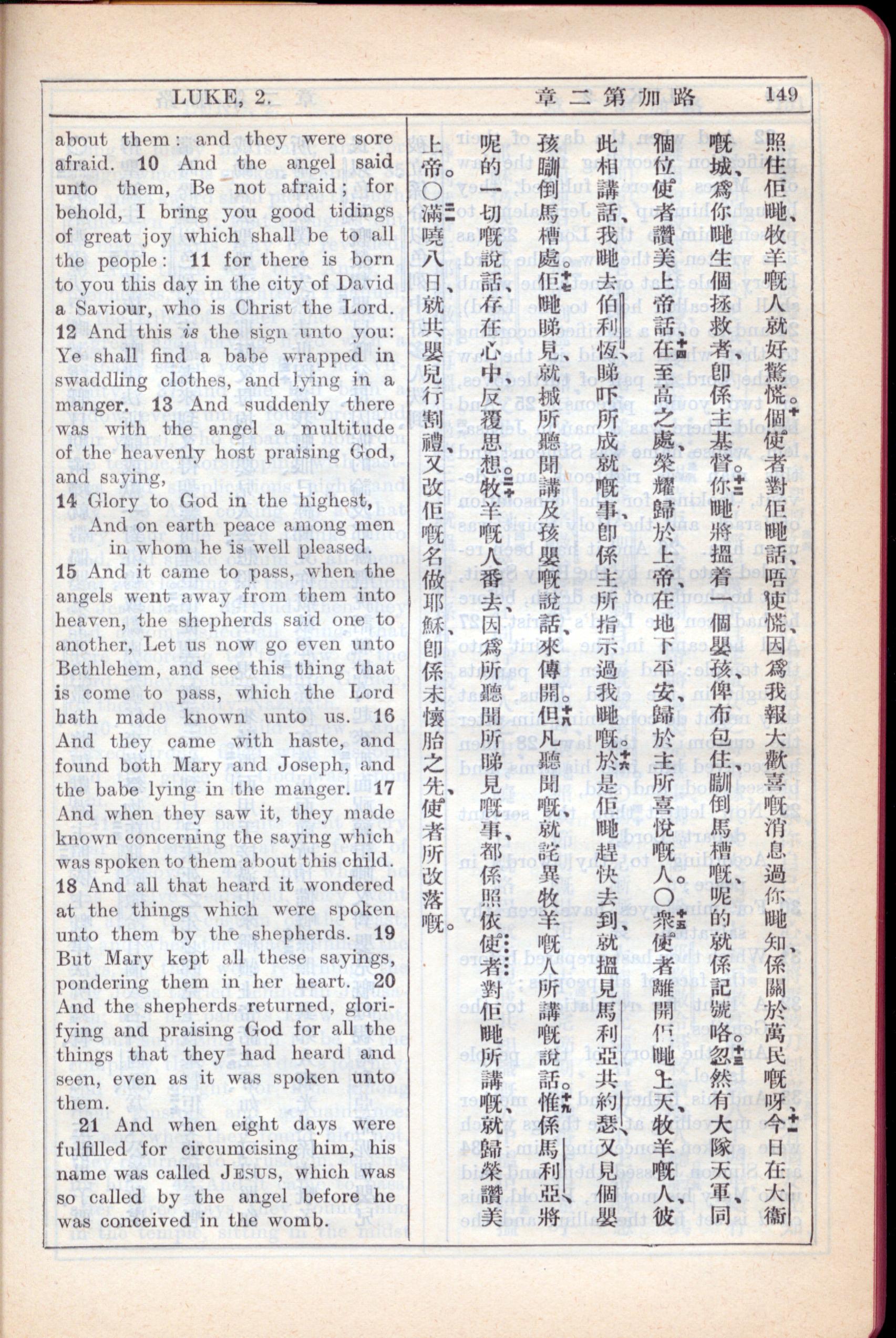 1931年新约全书广东话新译本与美国新译英文 路加福音 2 章 10 节到 2 章 21 节