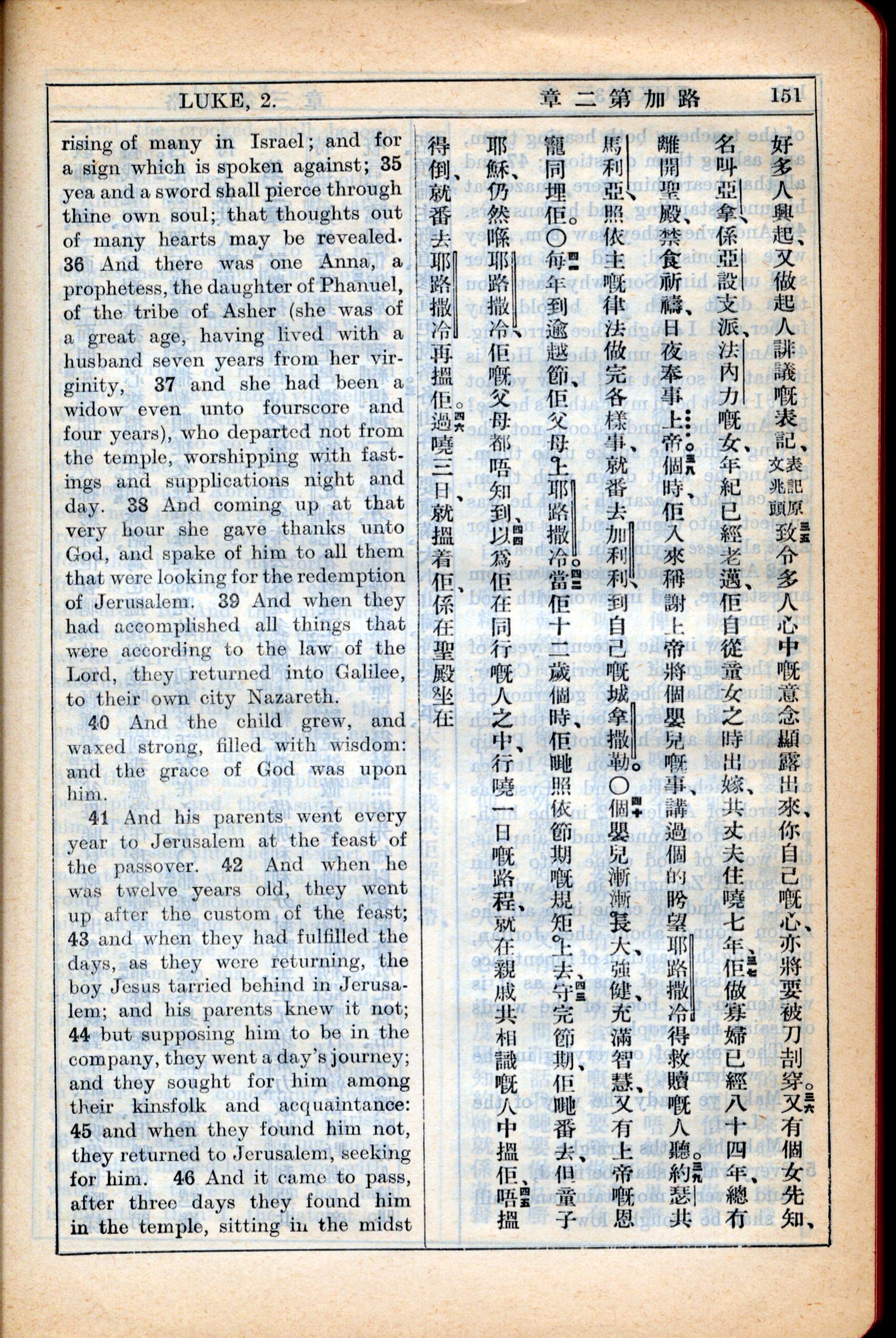 1931年新约全书广东话新译本与美国新译英文 路加福音 2 章 35 节到 2 章 46 节