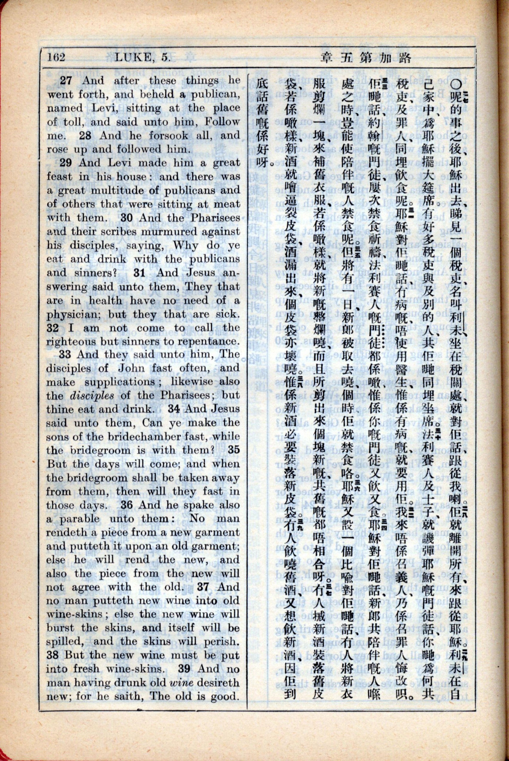 1931年新约全书广东话新译本与美国新译英文 路加福音 5 章 27 节到 5 章 39 节