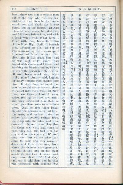 1931年新约全书广东话新译本与美国新译英文 路加福音 8 章 27 节到 8 章 36 节