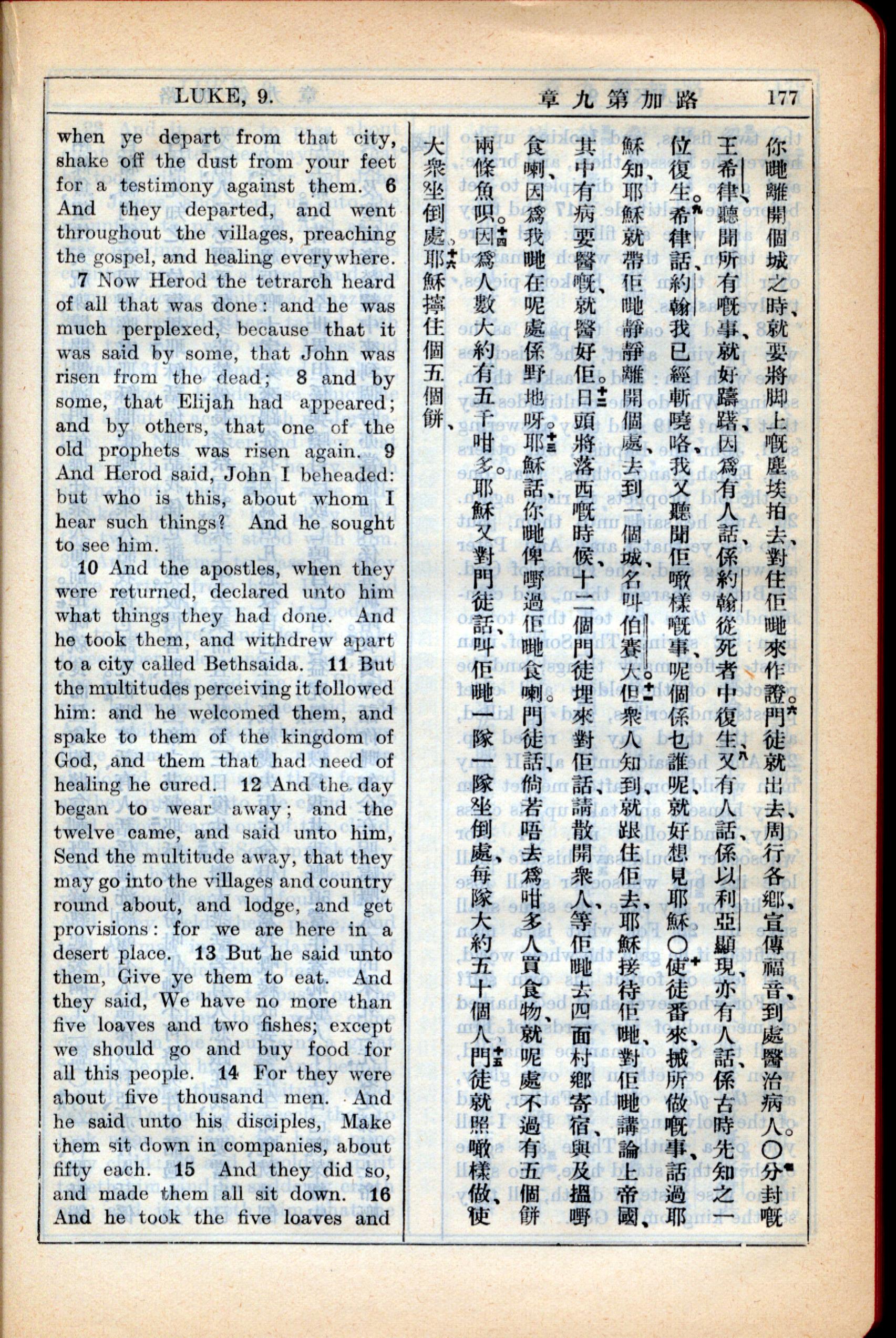 1931年新约全书广东话新译本与美国新译英文 路加福音 9 章 6 节到 9 章 15 节