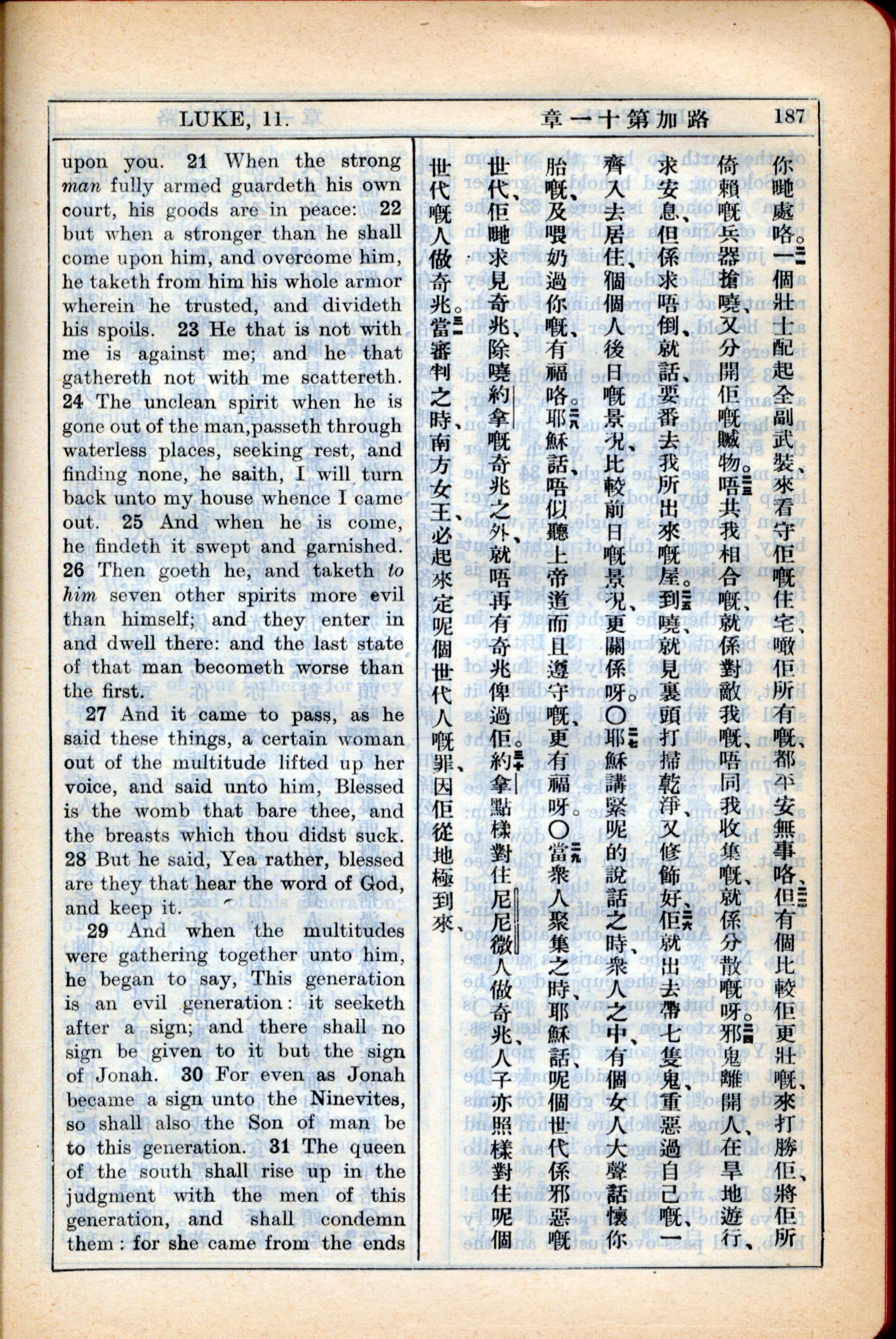 1931年新约全书广东话新译本与美国新译英文 路加福音 11 章 21 节到 11 章 31 节
