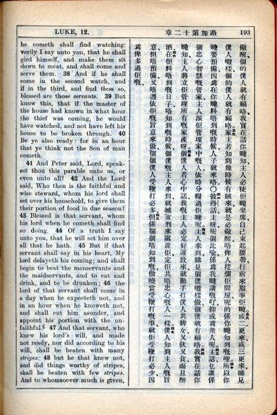 1931年新约全书广东话新译本与美国新译英文 路加福音 12 章 38 节到 12 章 48 节