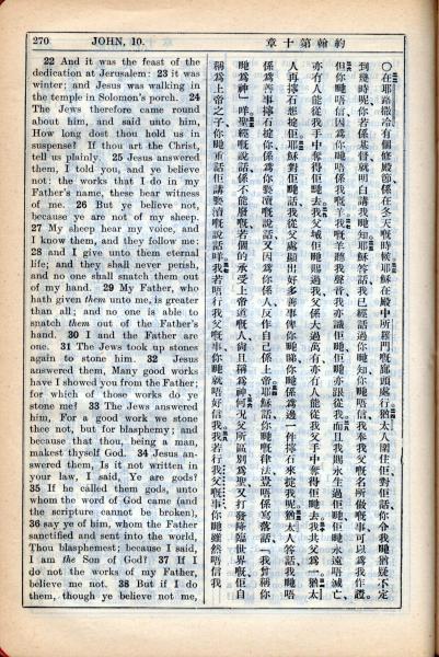 1931年新约全书广东话新译本与美国新译英文 约翰福音 10 章 22 节到 10 章 38 节