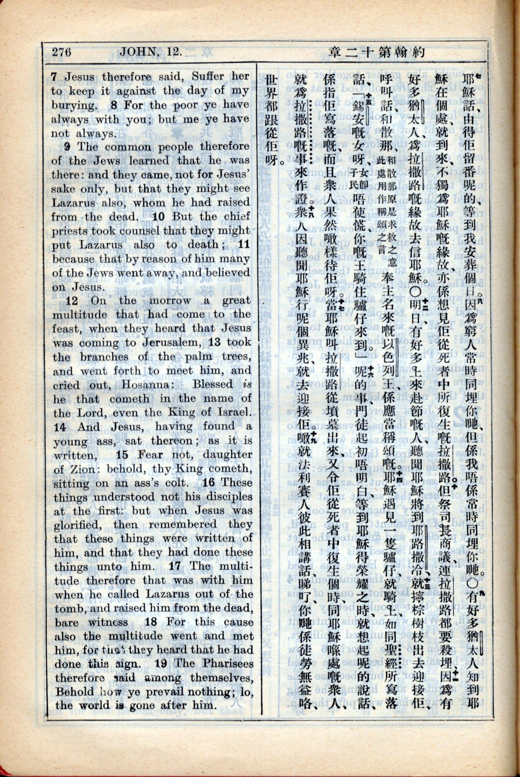 1931年新约全书广东话新译本与美国新译英文 约翰福音 12 章 7 节到 12 章 19 节