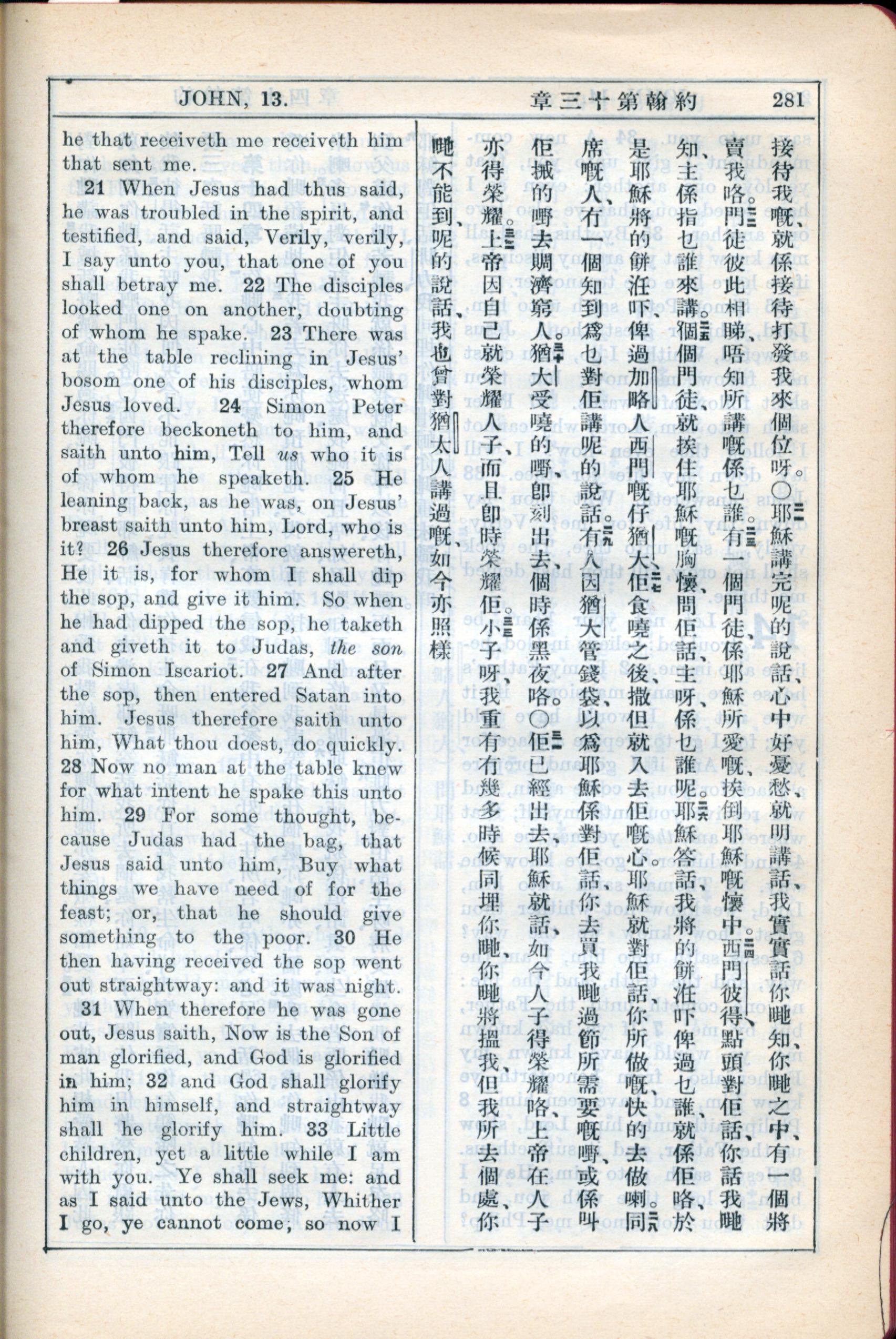 1931年新约全书广东话新译本与美国新译英文 约翰福音 13 章 21 节到 13 章 33 节