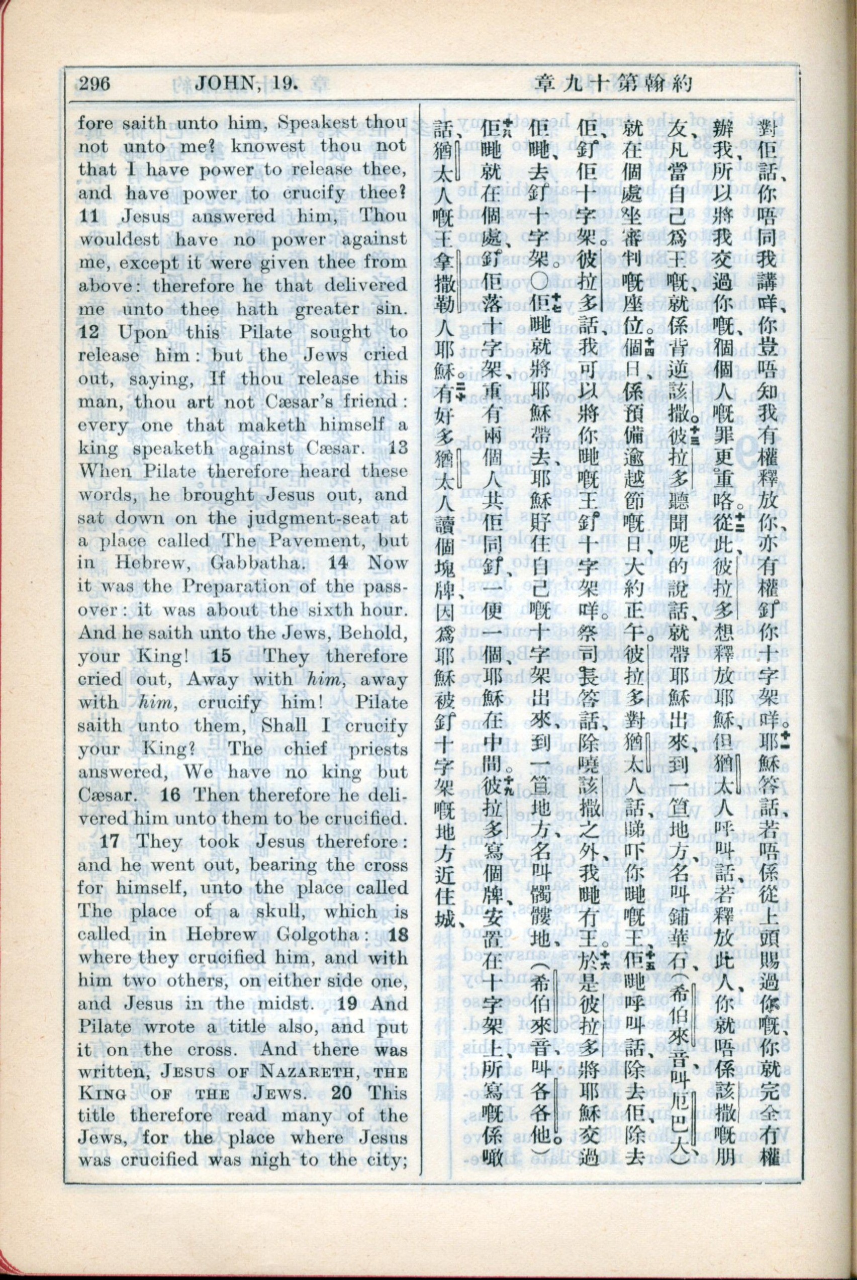 1931年新约全书广东话新译本与美国新译英文 约翰福音 19 章 10 节到 19 章 20 节