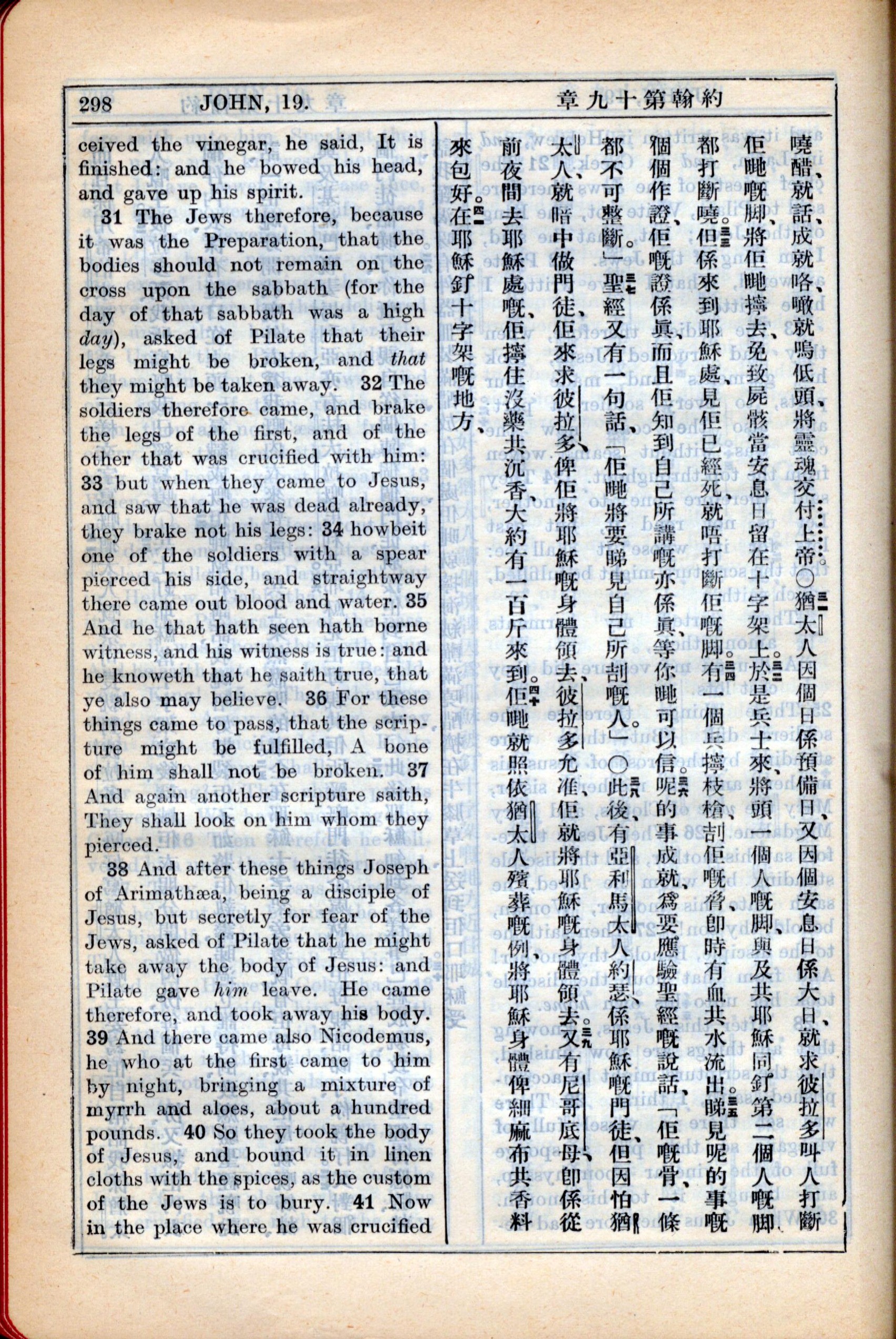 1931年新约全书广东话新译本与美国新译英文 约翰福音 19 章 31 节到 19 章 41 节