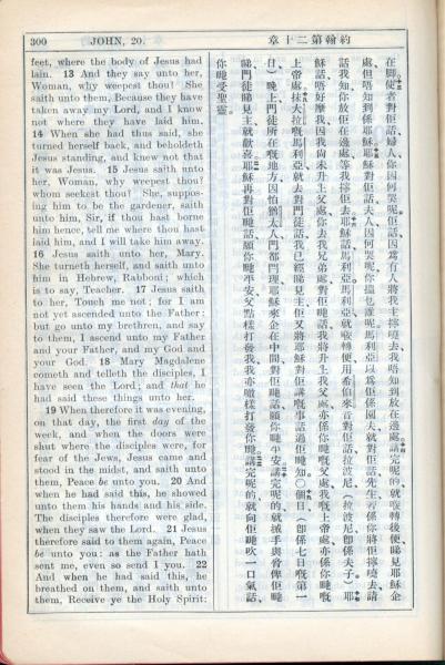 1931年新约全书广东话新译本与美国新译英文 约翰福音 20 章 13 节到 20 章 22 节