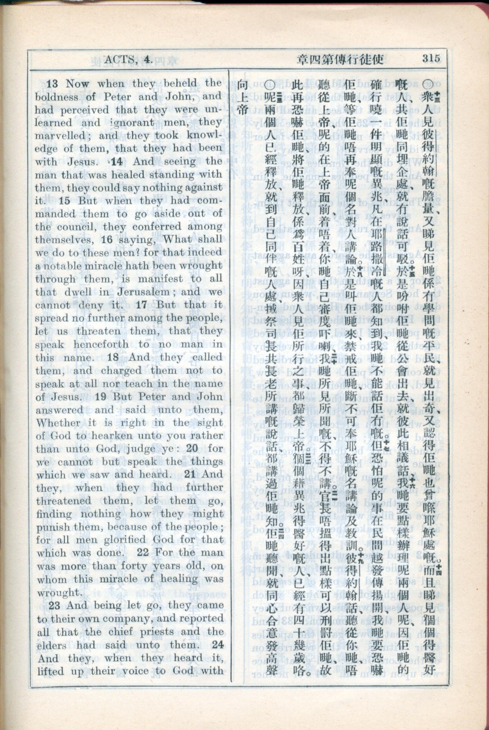 1931年新约全书广东话新译本与美国新译英文 使徒行传 4 章 13 节到 4 章 24 节