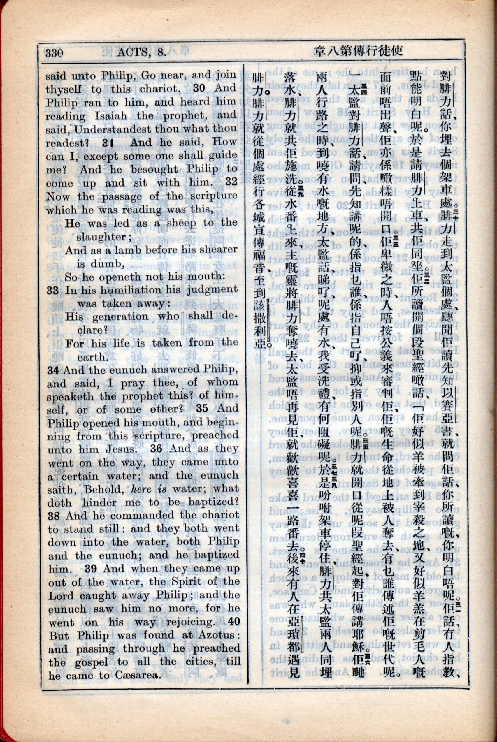 1931年新约全书广东话新译本与美国新译英文 使徒行传 8 章 30 节到 8 章 40 节