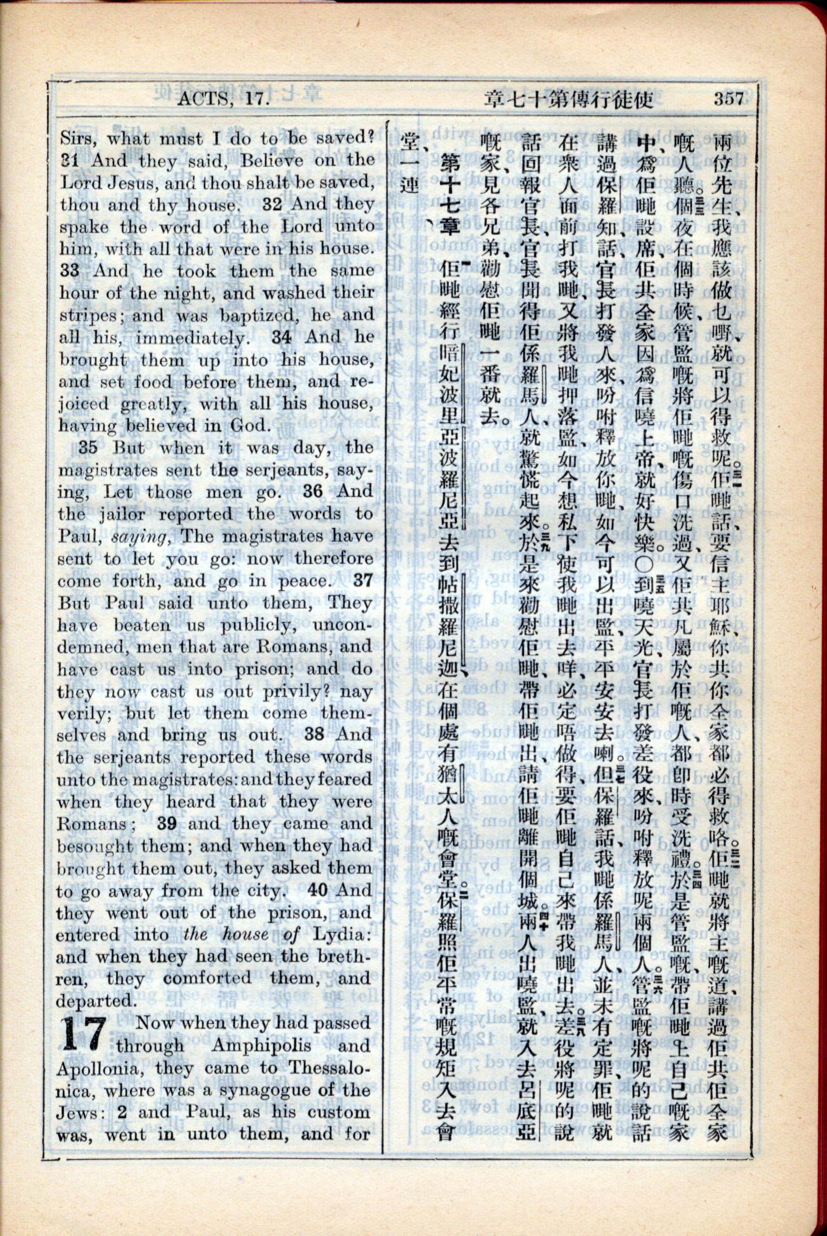 1931年新约全书广东话新译本与美国新译英文 使徒行传 16 章 31 节到 17 章 2 节