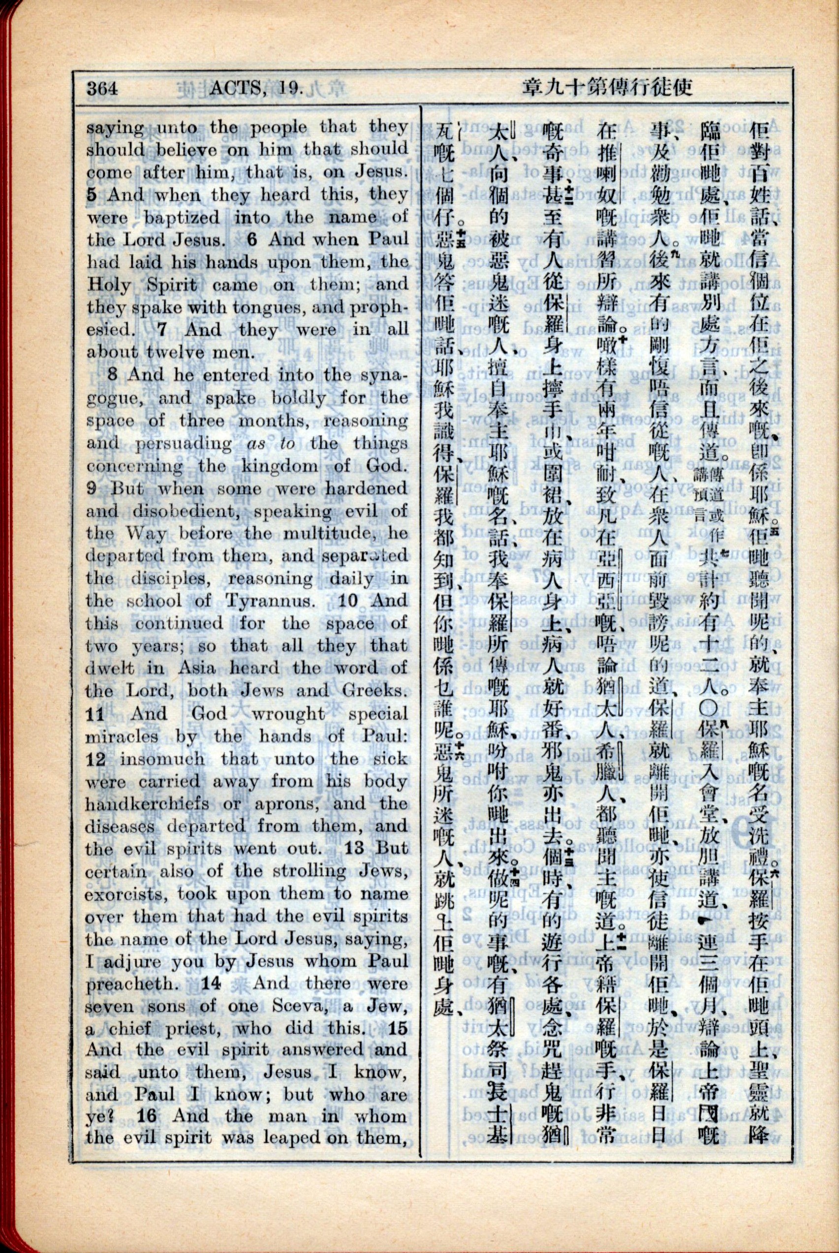 1931年新约全书广东话新译本与美国新译英文 使徒行传 19 章 5 节到 19 章 16 节