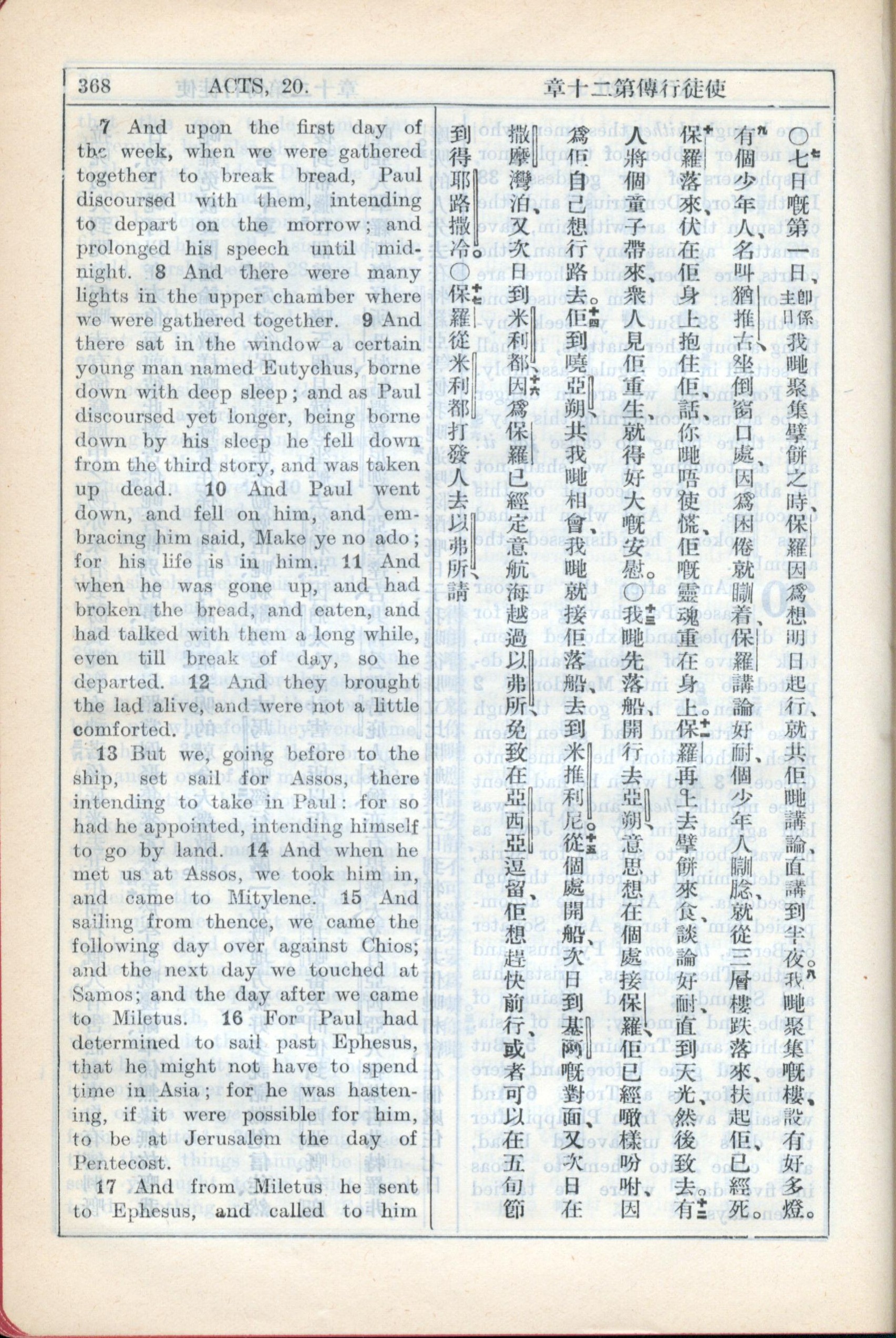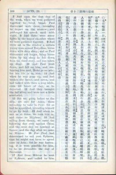 1931年新约全书广东话新译本与美国新译英文 使徒行传 20 章 7 节到 20 章 17 节