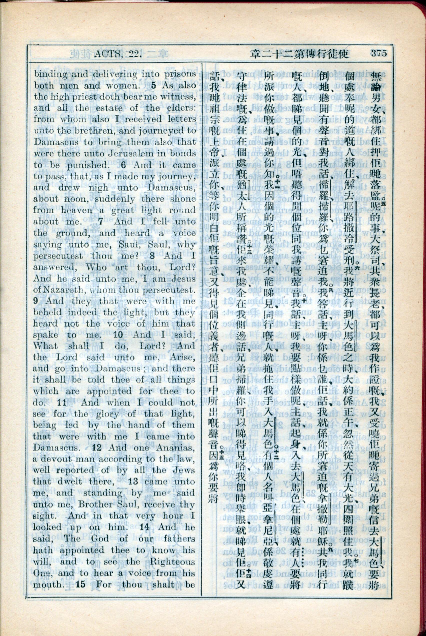 1931年新约全书广东话新译本与美国新译英文 使徒行传 22 章 5 节到 22 章 15 节