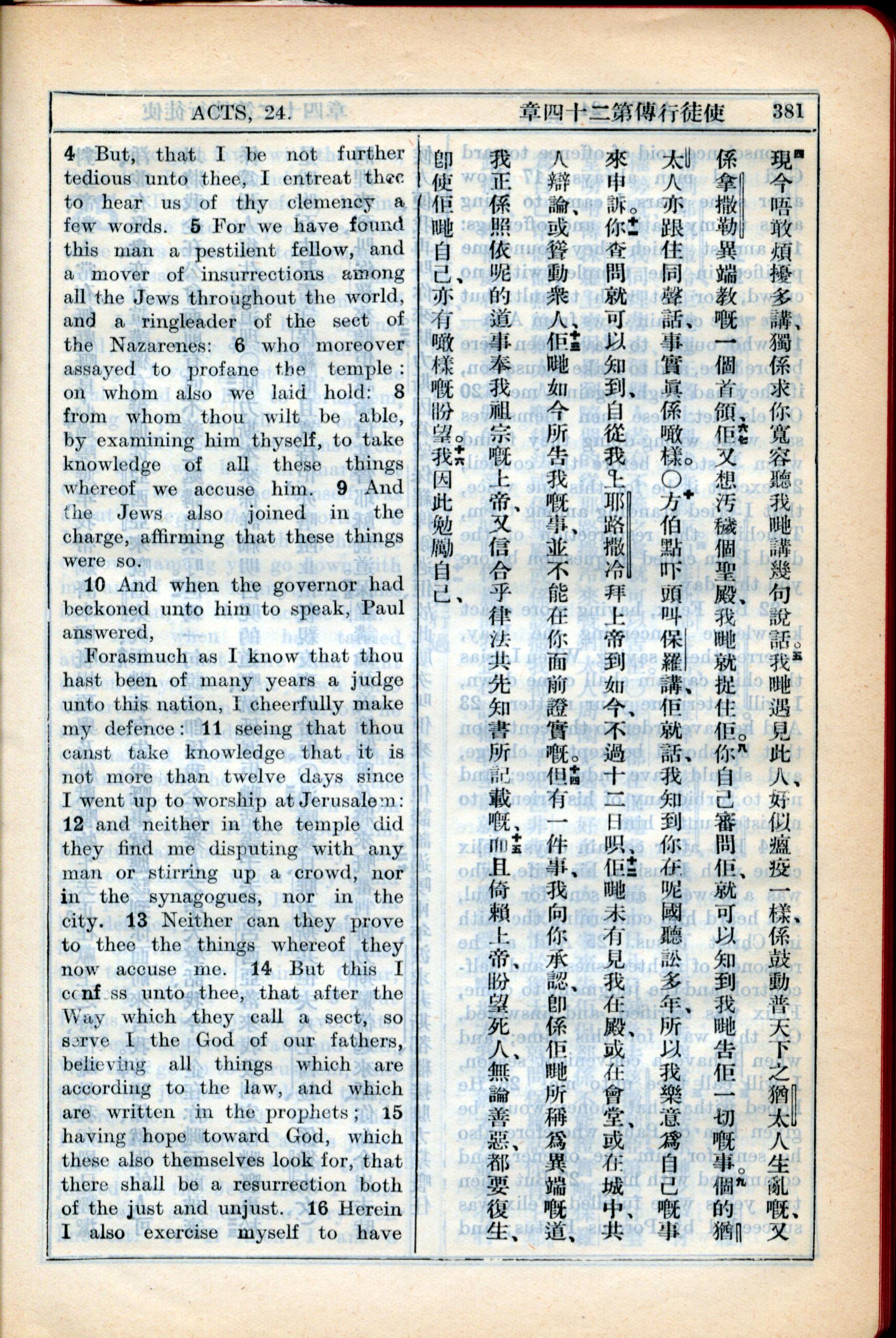 1931年新约全书广东话新译本与美国新译英文 使徒行传 24 章 4 节到 24 章 16 节