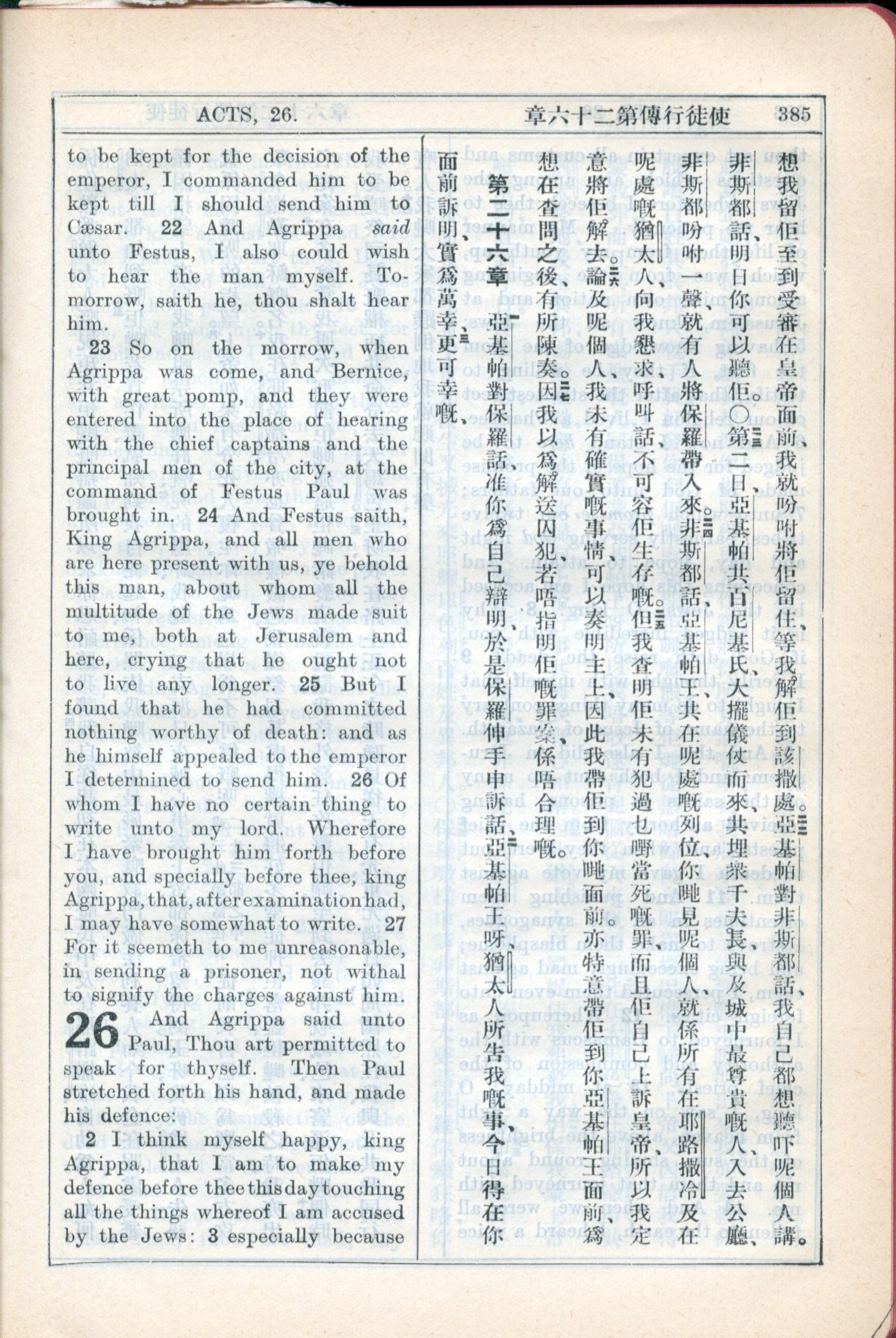 1931年新约全书广东话新译本与美国新译英文 使徒行传 25 章 21 节到 26 章 2 节
