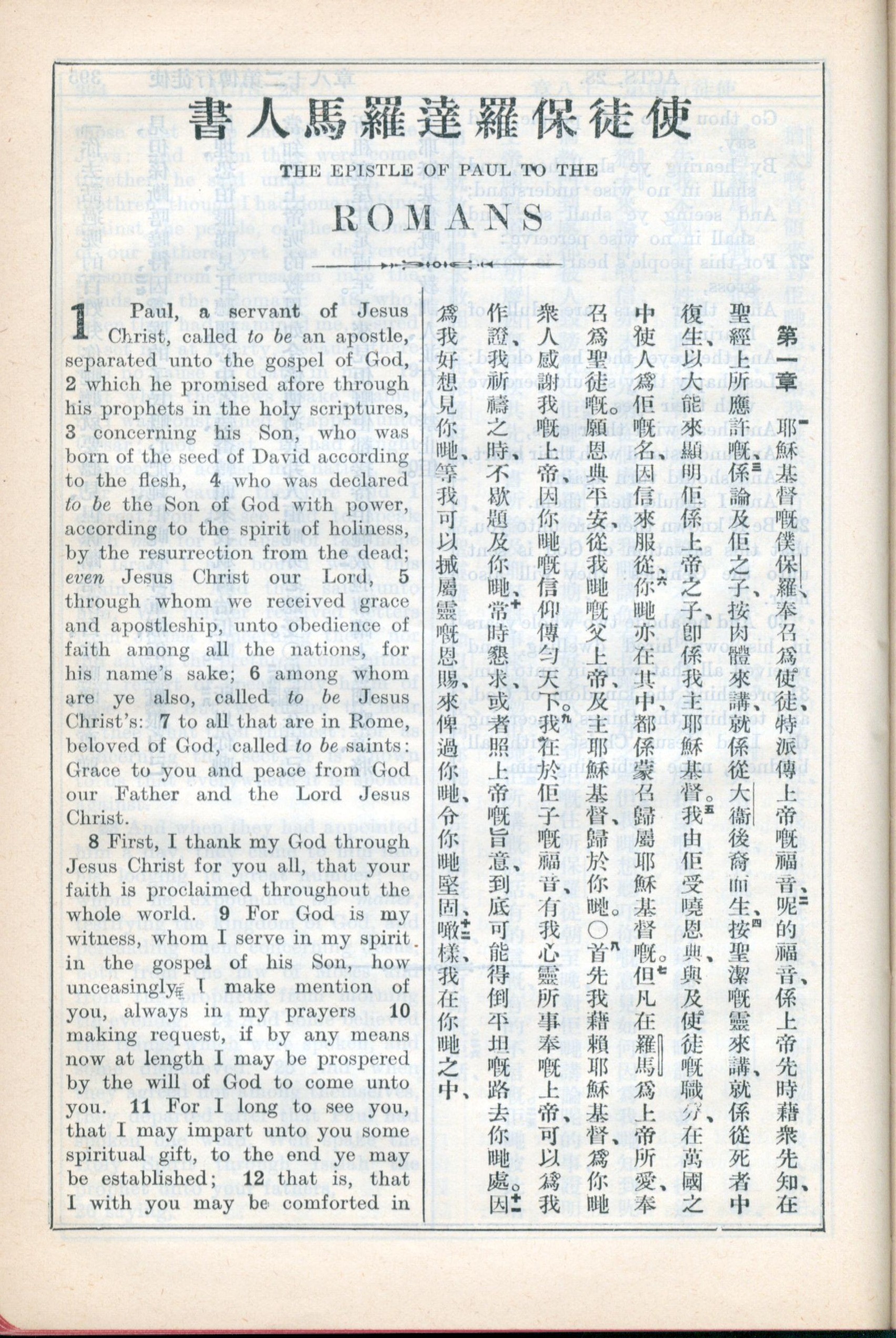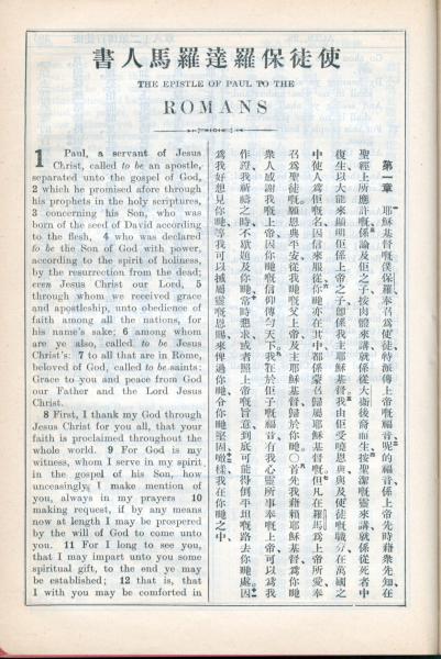 1931年新约全书广东话新译本与美国新译英文 罗马书 1 章 1 节到 1 章 12 节