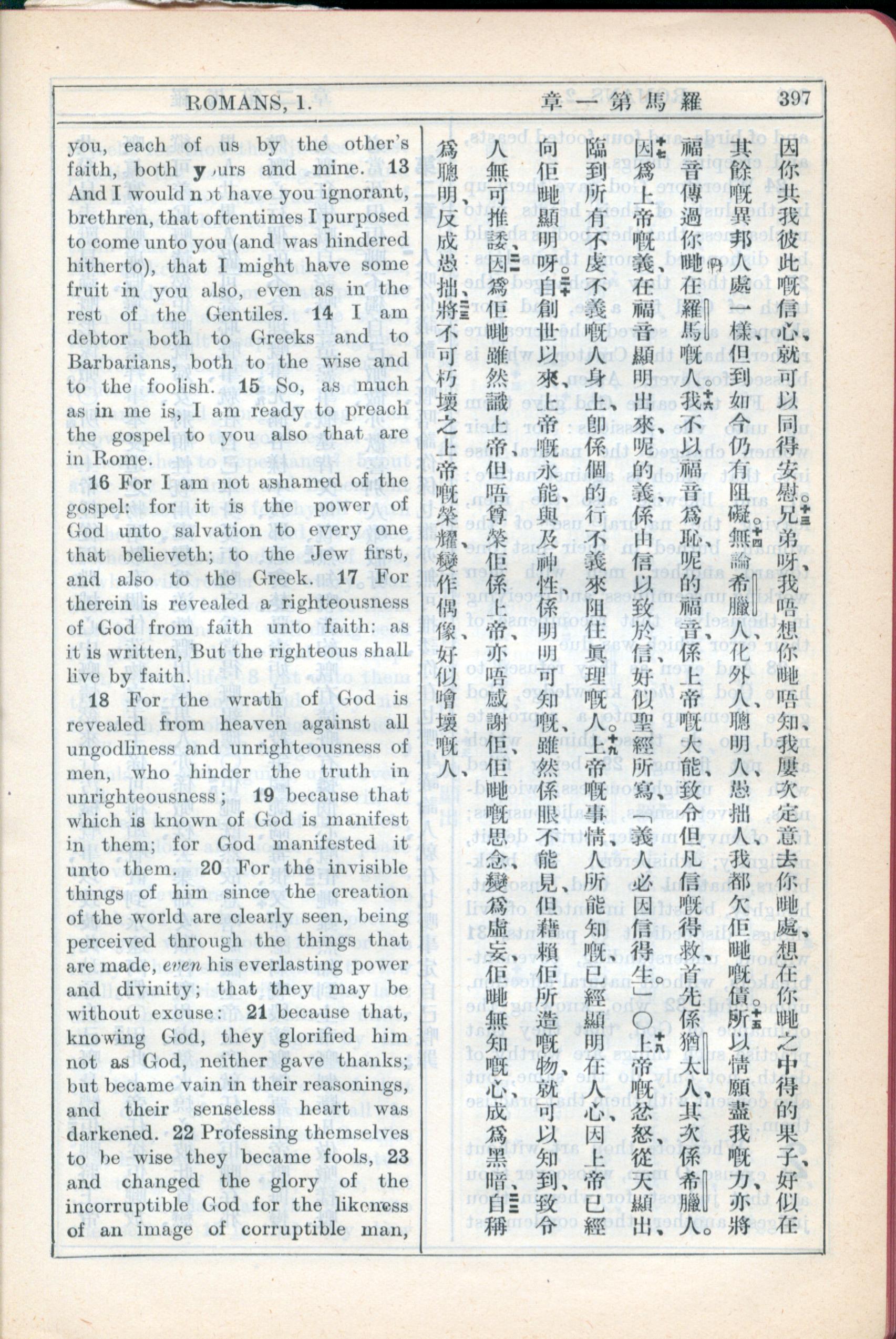 1931年新约全书广东话新译本与美国新译英文 罗马书 1 章 13 节到 1 章 23 节