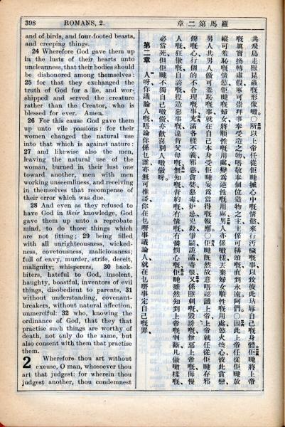1931年新约全书广东话新译本与美国新译英文 罗马书 1 章 24 节到 2 章 1 节