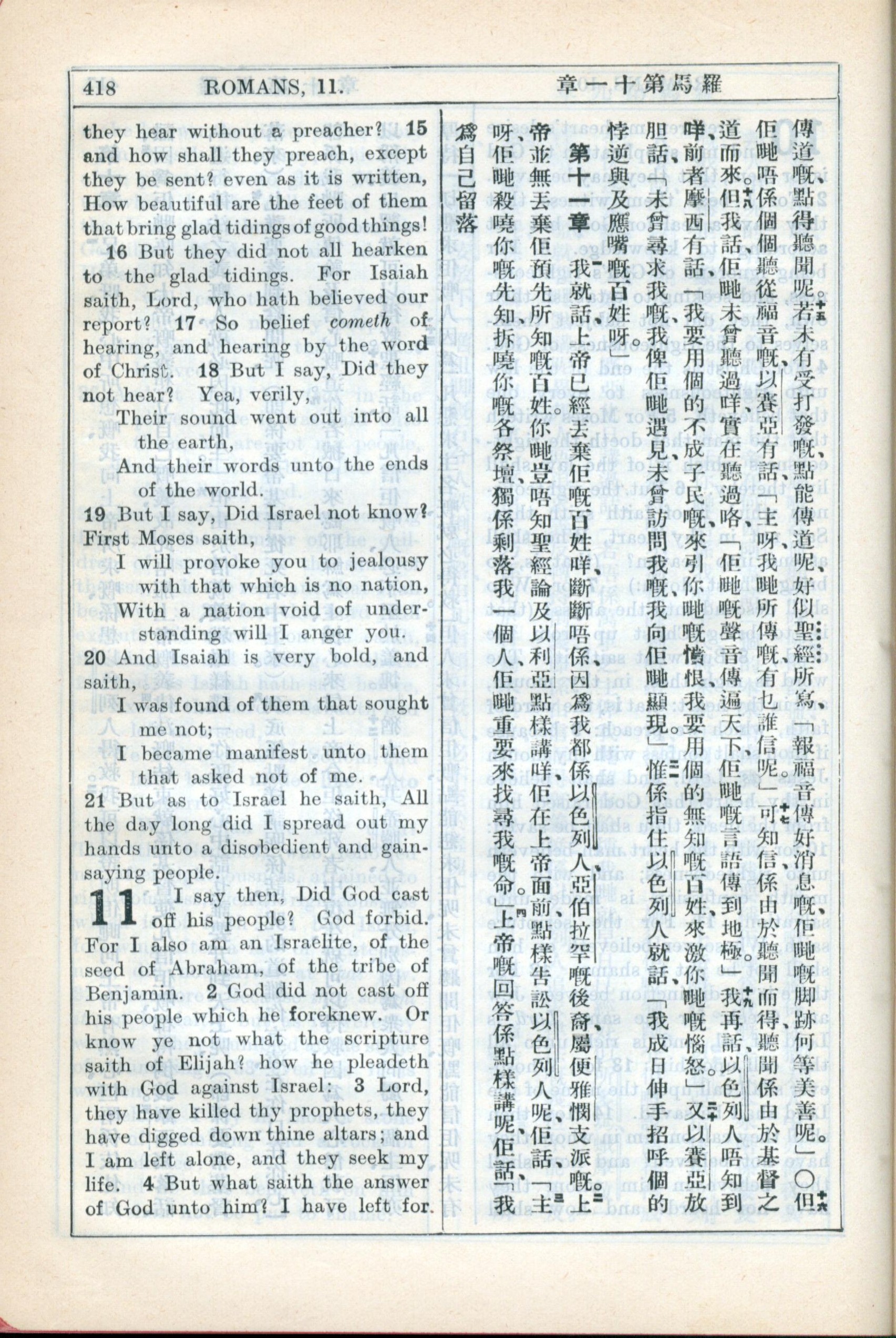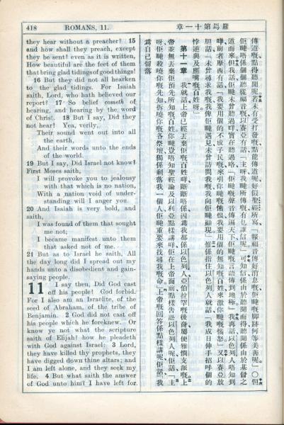 1931年新约全书广东话新译本与美国新译英文 罗马书 10 章 15 节到 11 章 4 节
