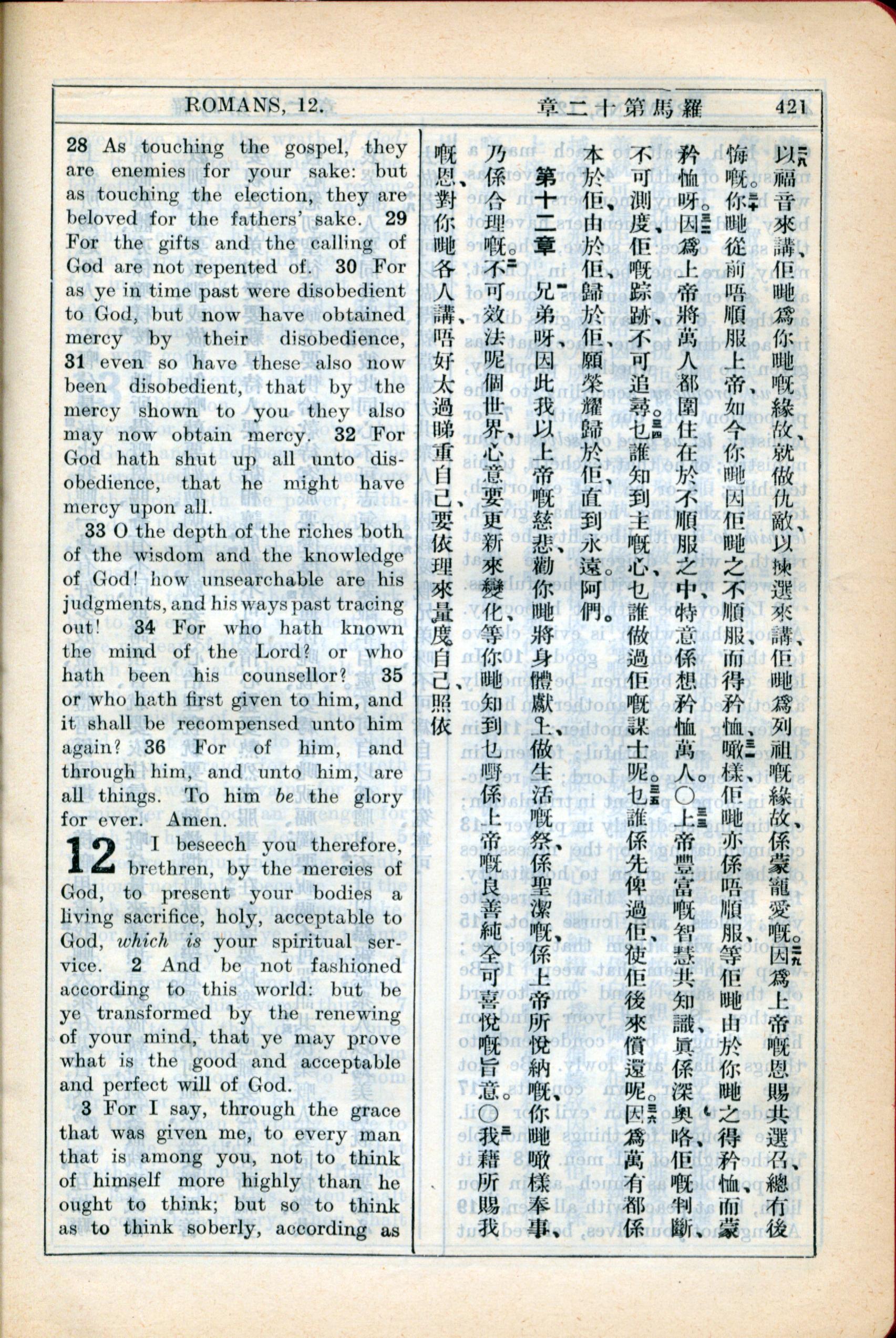 1931年新约全书广东话新译本与美国新译英文 罗马书 11 章 28 节到 12 章 3 节