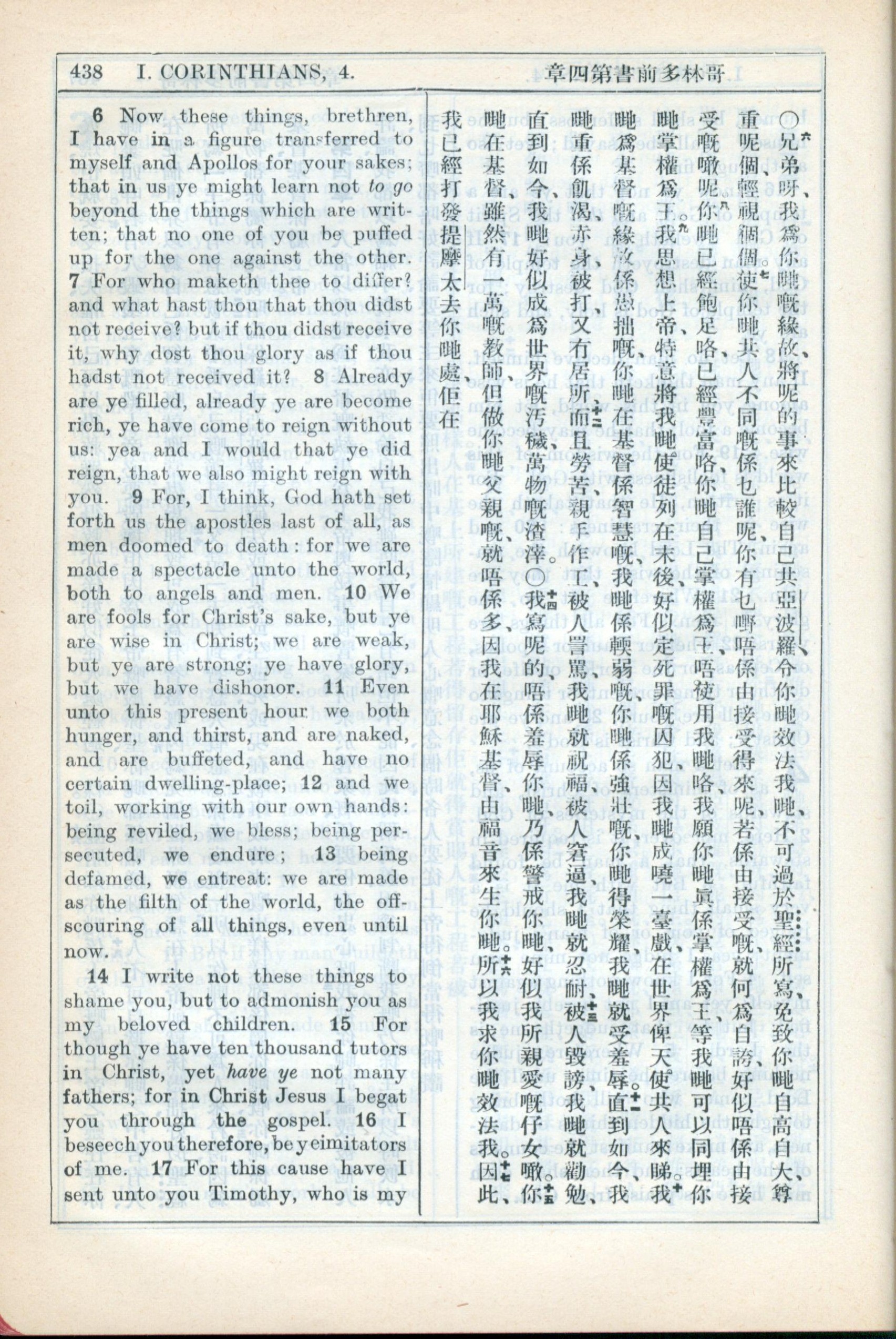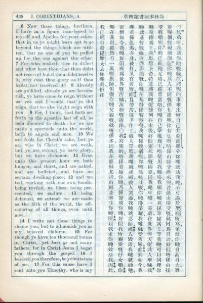 1931年新约全书广东话新译本与美国新译英文 哥林多前书 4 章 6 节到 4 章 17 节