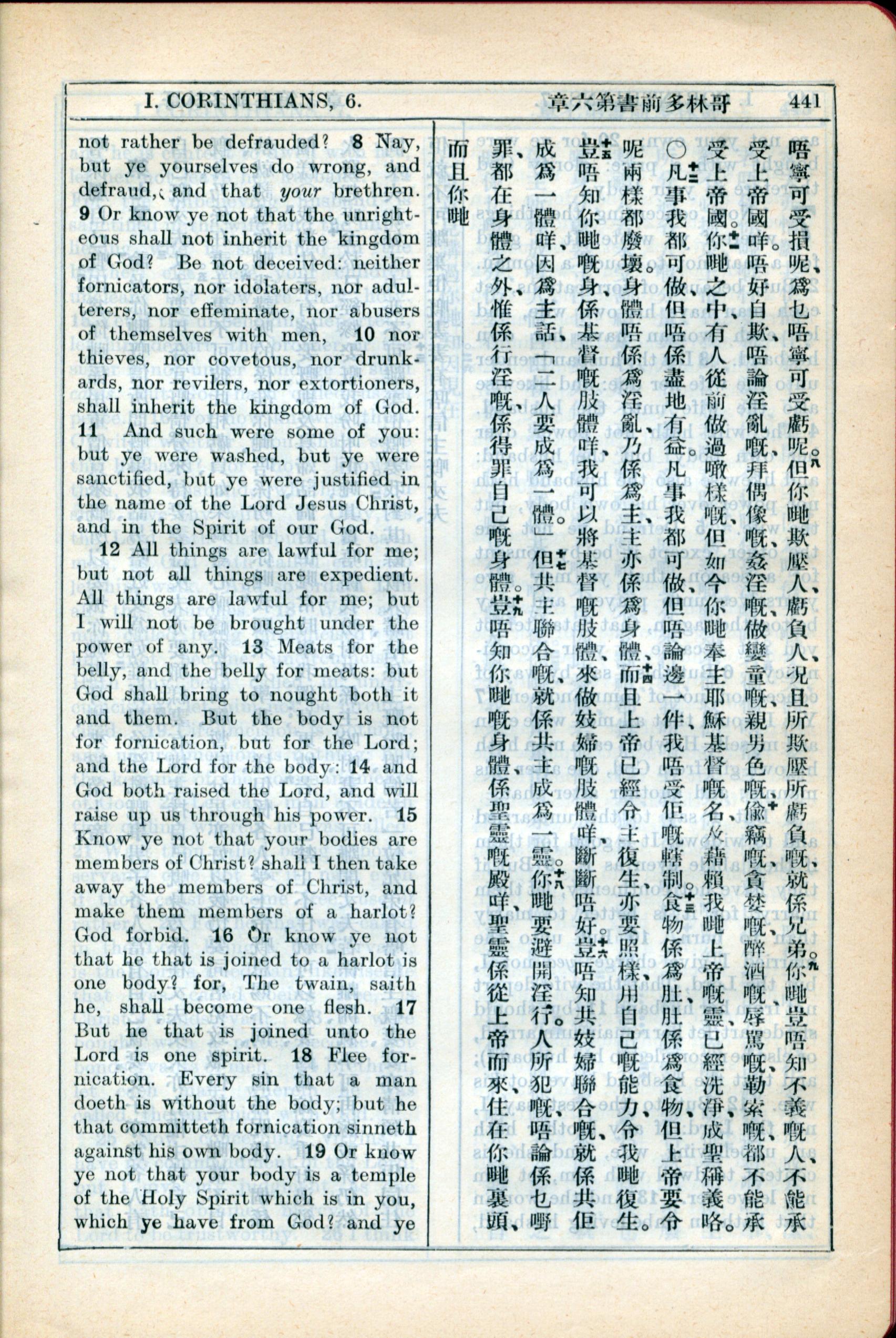 1931年新约全书广东话新译本与美国新译英文 哥林多前书 6 章 8 节到 6 章 19 节