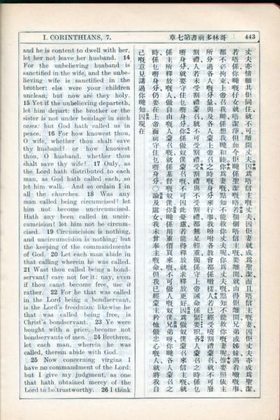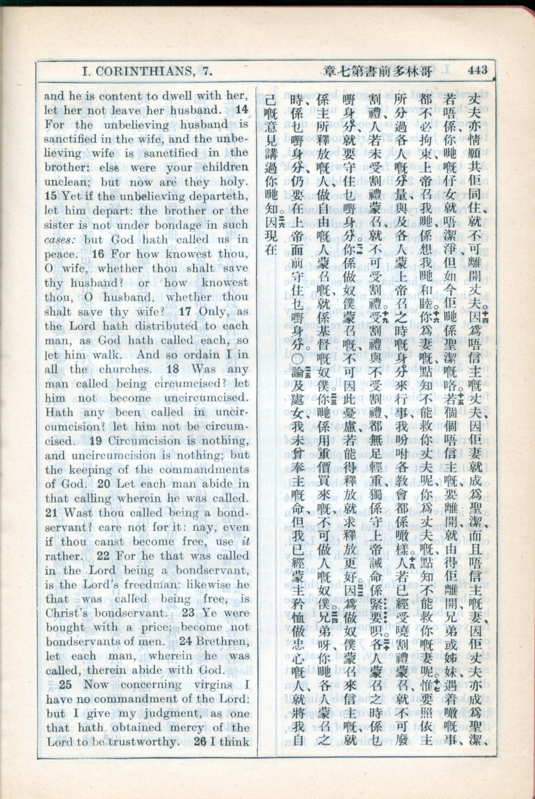 1931年新约全书广东话新译本与美国新译英文 哥林多前书 7 章 14 节到 7 章 25 节