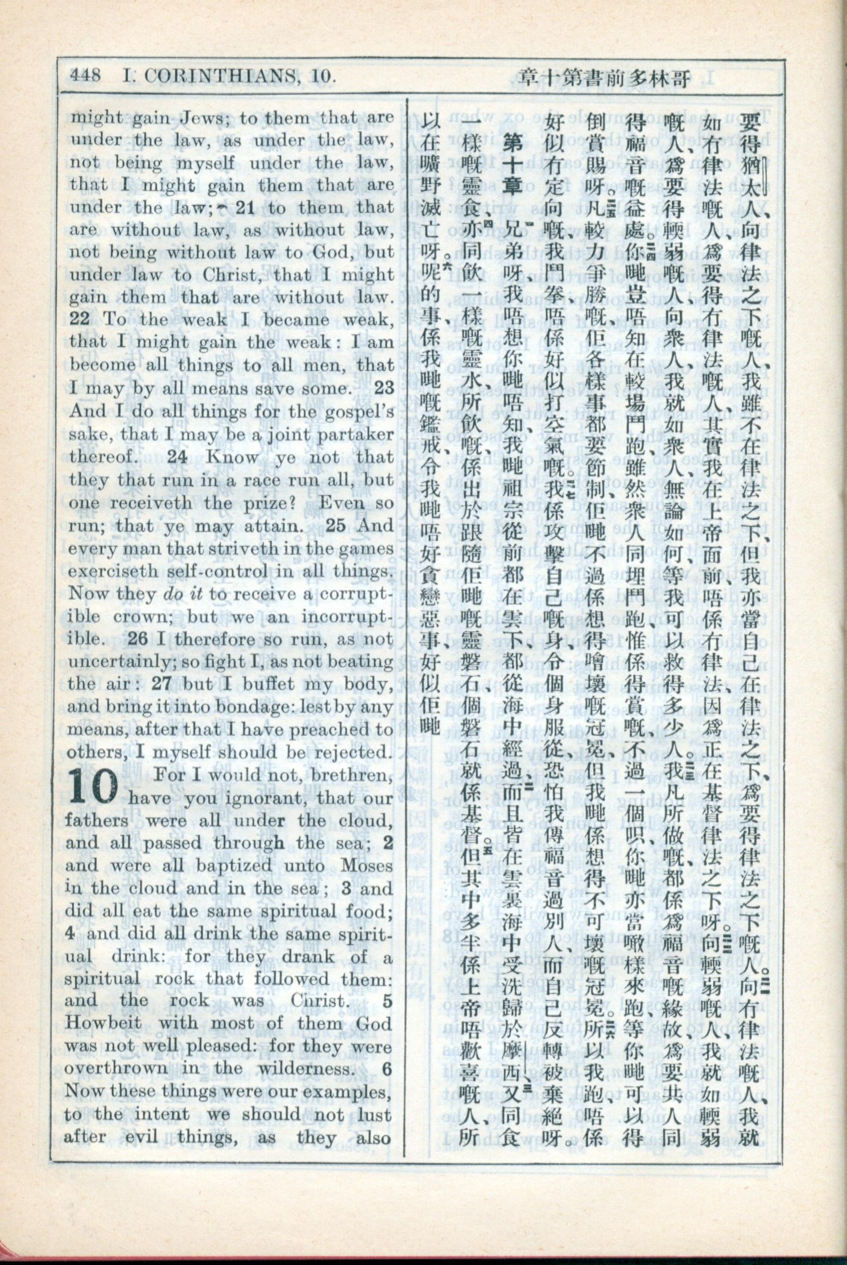 1931年新约全书广东话新译本与美国新译英文 哥林多前书 9 章 21 节到 10 章 6 节