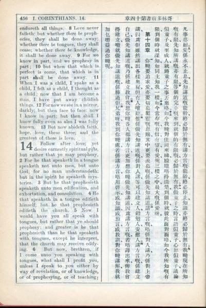1931年新约全书广东话新译本与美国新译英文 哥林多前书 13 章 8 节到 14 章 6 节
