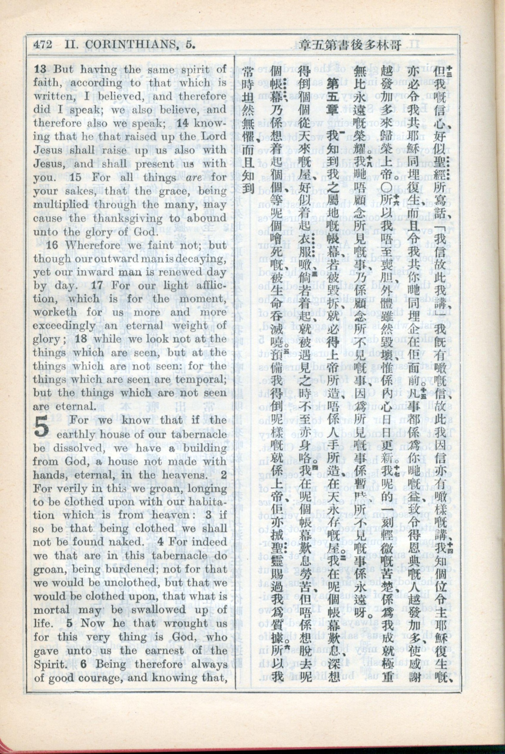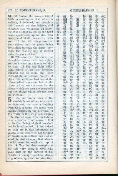 1931年新约全书广东话新译本与美国新译英文 哥林多后书 4 章 13 节到 5 章 6 节