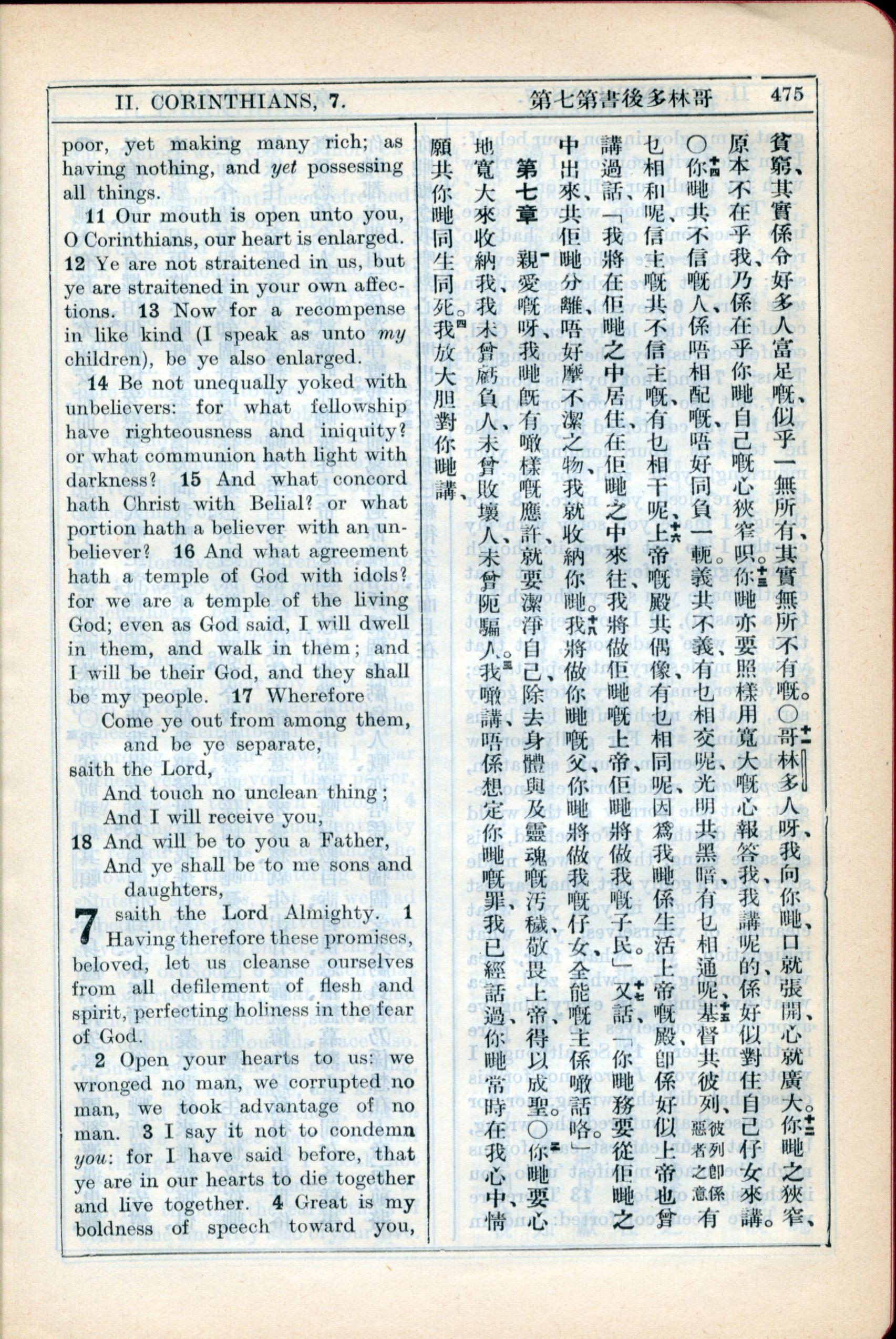 1931年新约全书广东话新译本与美国新译英文 哥林多后书 6 章 11 节到 7 章 4 节