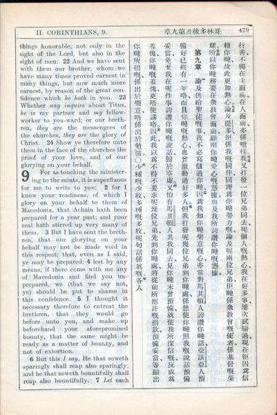 1931年新约全书广东话新译本与美国新译英文 哥林多后书 8 章 22 节到 9 章 6 节