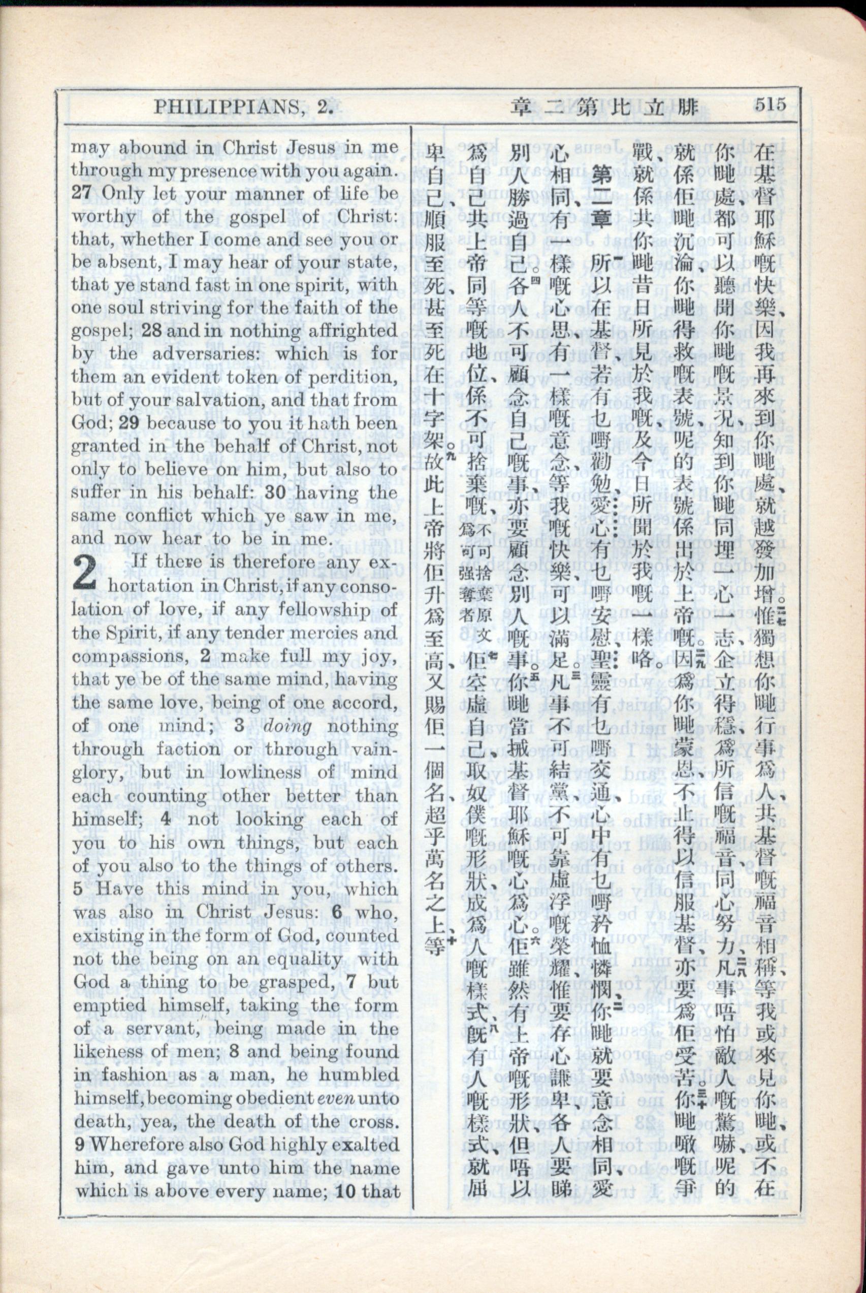 1931年新约全书广东话新译本与美国新译英文 腓立比书 1 章 26 节到 2 章 9 节