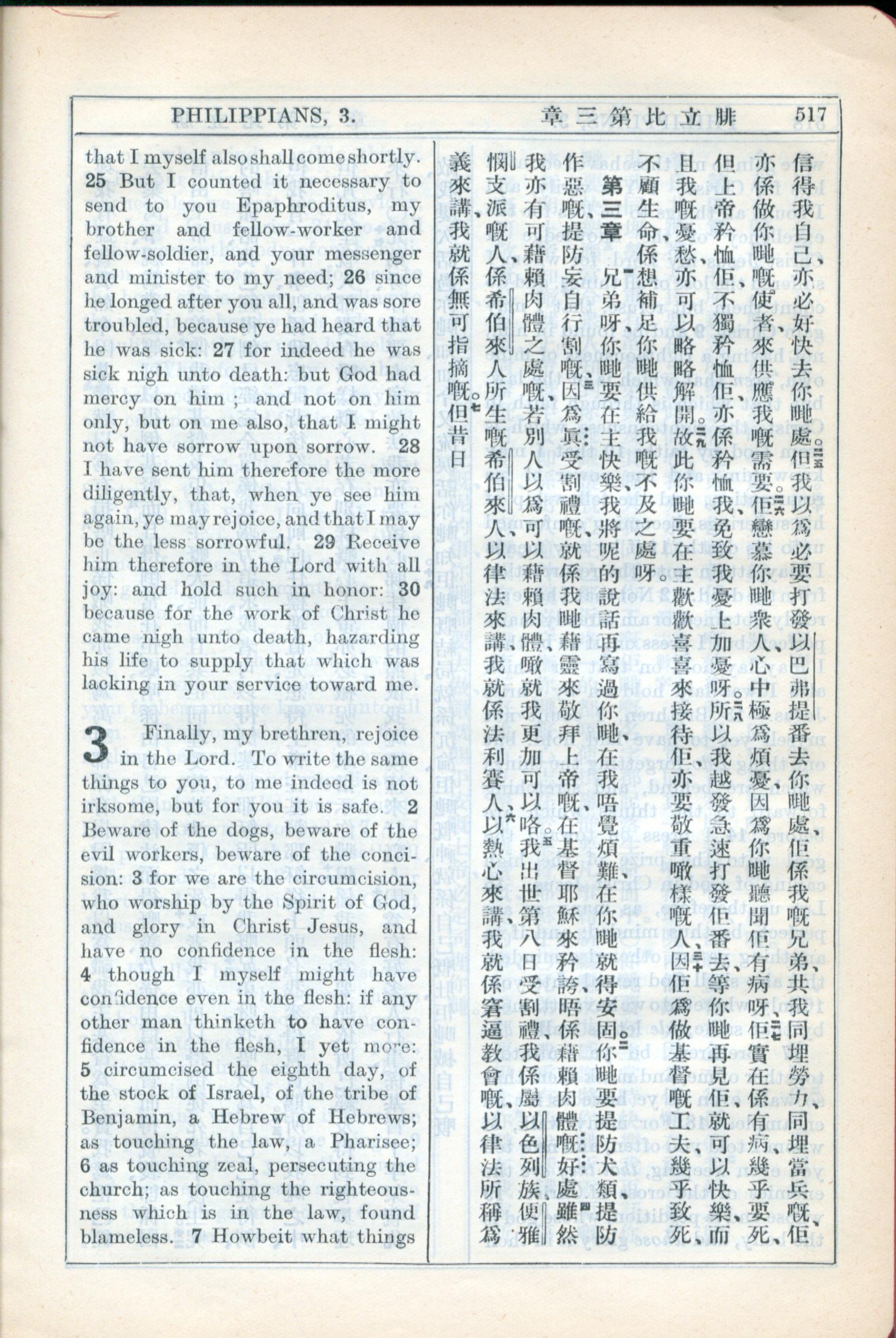 1931年新约全书广东话新译本与美国新译英文 腓立比书 2 章 25 节到 3 章 7 节