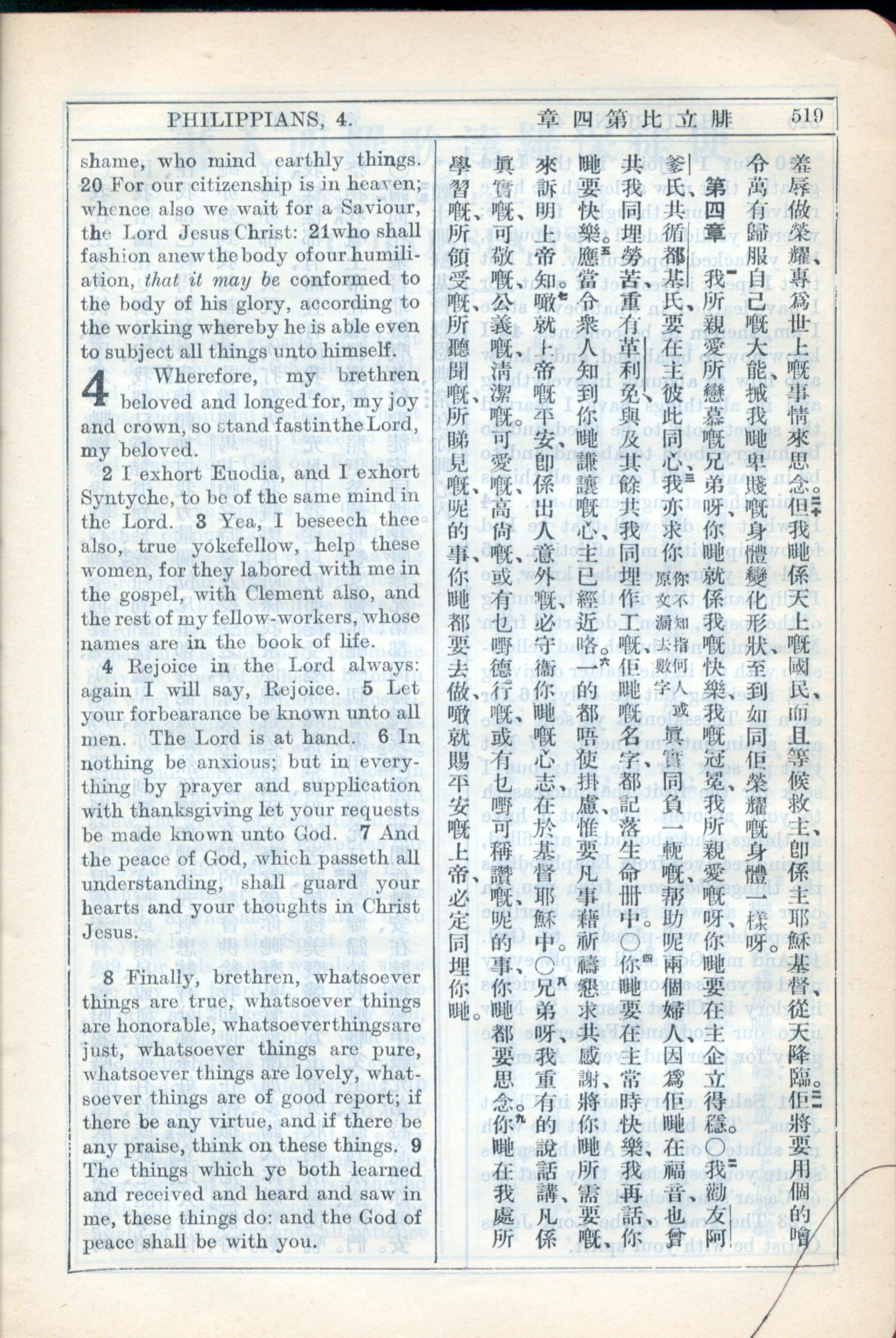 1931年新约全书广东话新译本与美国新译英文 腓立比书 3 章 20 节到 4 章 9 节
