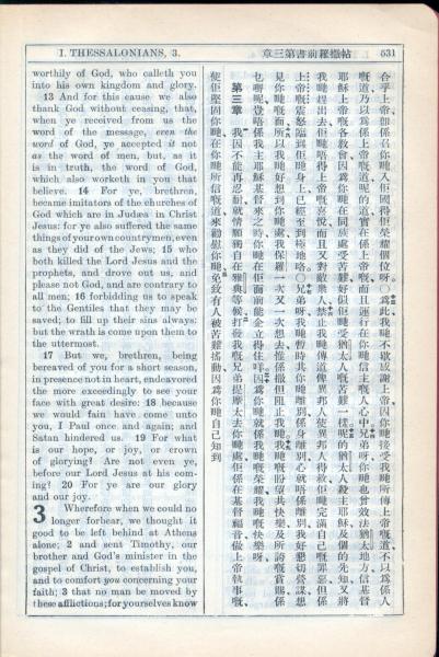 1931年新约全书广东话新译本与美国新译英文 帖撒罗尼迦前书 2 章 13 节到 3 章 3 节